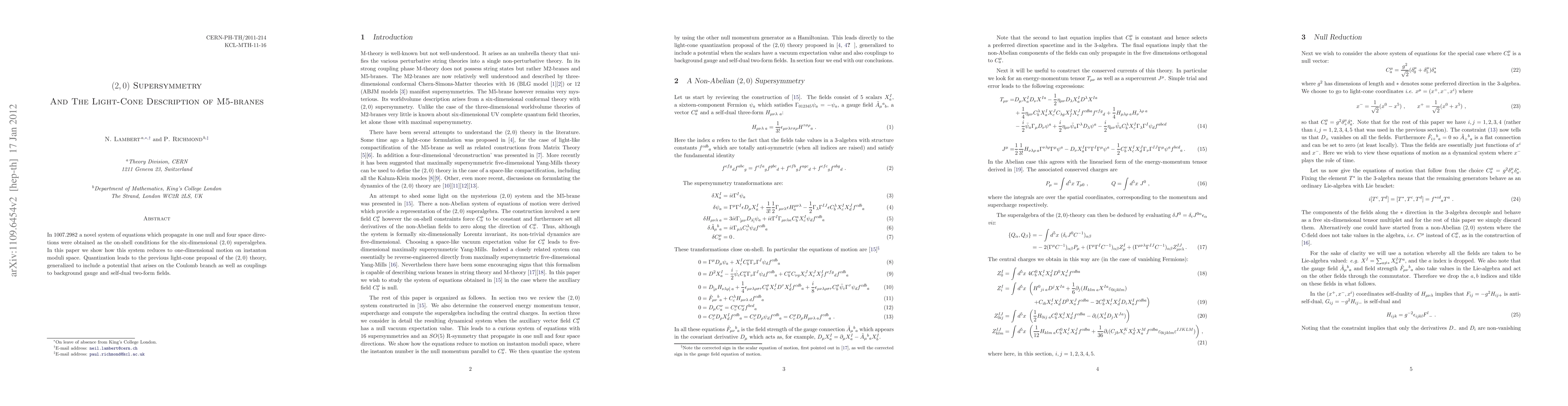 This paper explores the (2,0) supersymmetry in the context of M5-branes, demonstrating how the derived equations reduce to one-dimensional motion on instanton moduli space. The quantization process generalizes the light-cone proposal of the (2,0) theory, incorporating potentials and couplings from the Coulomb branch and background gauge fields.