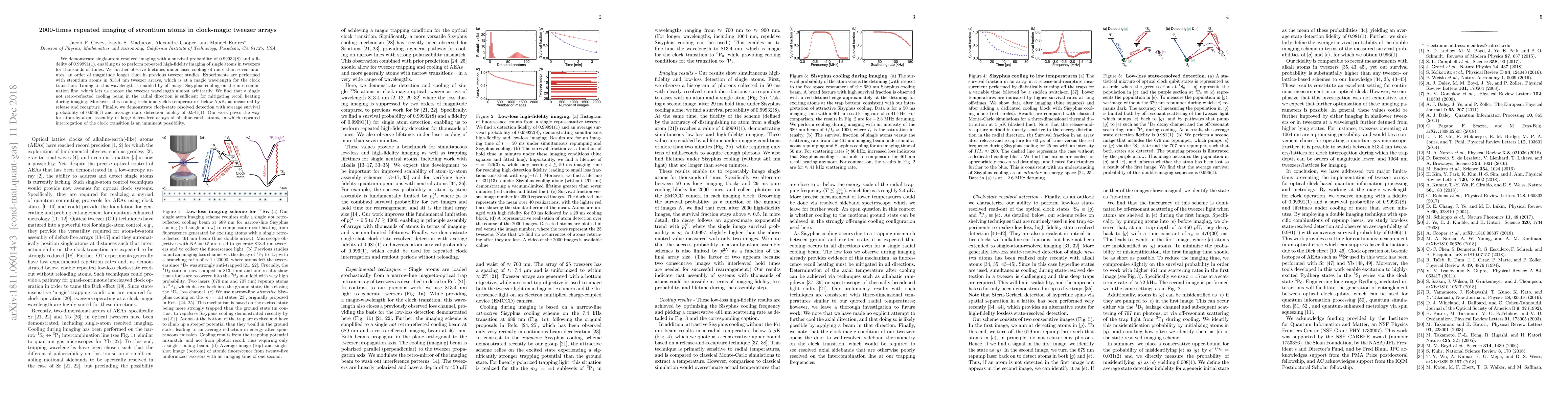 We demonstrate single-atom resolved imaging with a survival probability of $0.99932(8)$ and a fidelity of $0.99991(1)$, enabling us to perform repeated high-fidelity imaging of single atoms in tweezers for thousands of times. We further observe lifetimes under laser cooling of more than seven minutes, an order of magnitude longer than in previous tweezer studies. Experiments are performed with strontium atoms in $813.4~\text{nm}$ tweezer arrays, which is at a magic wavelength for the clock transition. Tuning to this wavelength is enabled by off-magic Sisyphus cooling on the intercombination line, which lets us choose the tweezer wavelength almost arbitrarily. We find that a single not retro-reflected cooling beam in the radial direction is sufficient for mitigating recoil heating during imaging. Moreover, this cooling technique yields temperatures below $5~\mu$K, as measured by release and recapture. Finally, we demonstrate clock-state resolved detection with average survival probability of $0.996(1)$ and average state detection fidelity of $0.981(1)$. Our work paves the way for atom-by-atom assembly of large defect-free arrays of alkaline-earth atoms, in which repeated interrogation of the clock transition is an imminent possibility.