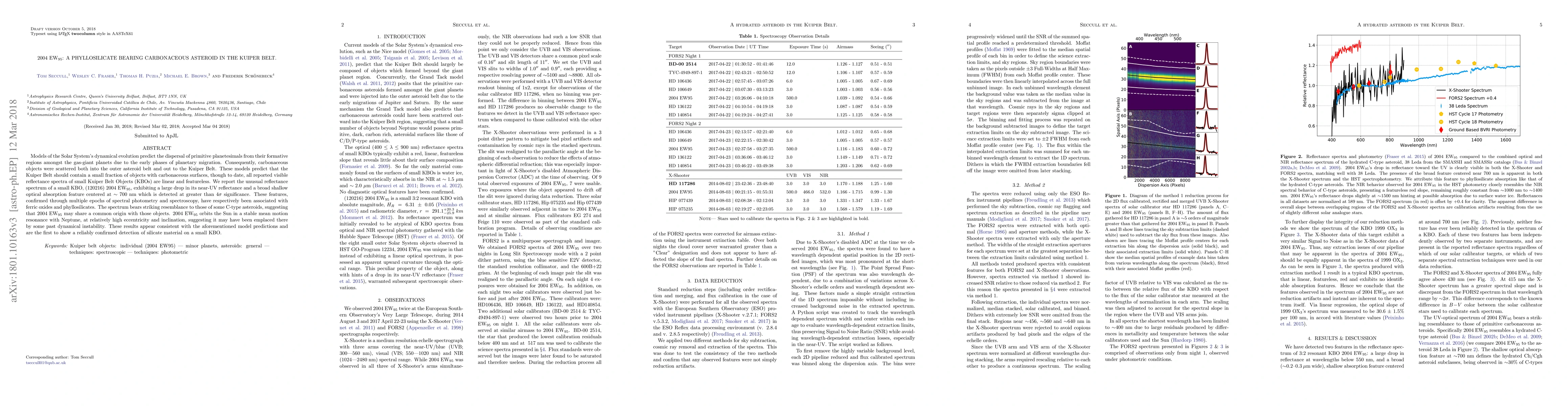 The paper reports the unusual reflectance spectrum of Kuiper Belt Object (120216) 2004 EW95, revealing features indicative of ferric oxides and phyllosilicates, suggesting a carbonaceous origin similar to C-type asteroids. This discovery supports models predicting the presence of carbonaceous material in the Kuiper Belt due to early planetary migration and dynamical instabilities.