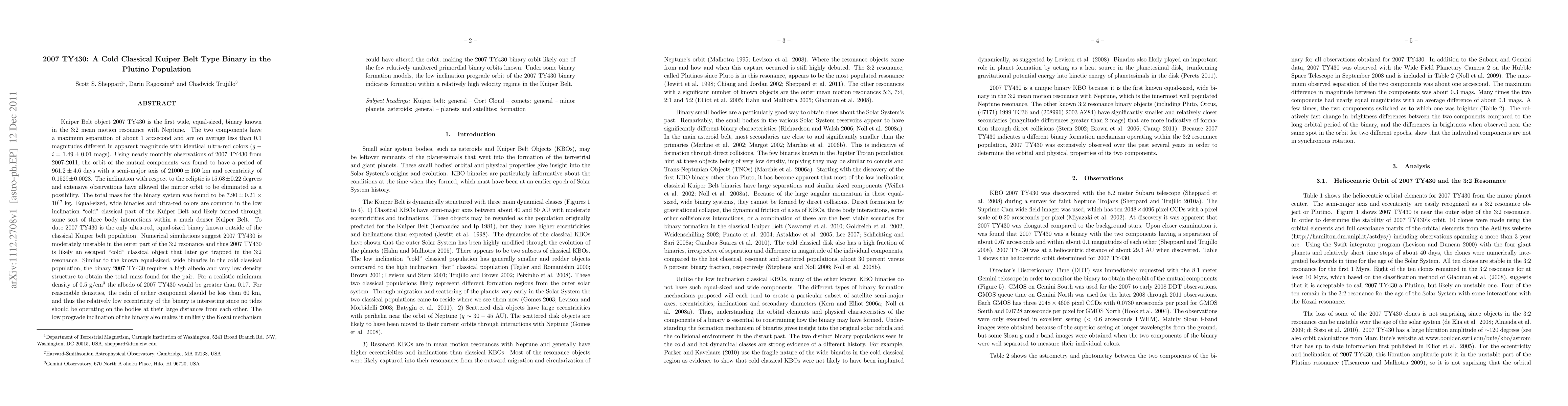 2007 TY430 is a rare, wide, equal-sized binary in the Plutino population, exhibiting ultra-red colors and a low eccentricity, suggesting it formed in the dense, cold classical Kuiper Belt through three-body interactions. Its orbit and properties indicate it is likely an unaltered primordial binary.