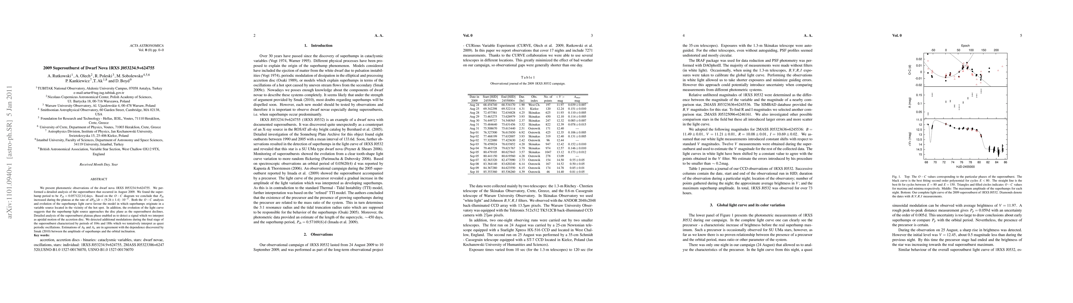 This paper reports photometric observations of the dwarf nova 1RXS J053234.9+624755 during its 2009 superoutburst, finding a superhump period of P_sh=0.057122(14) days, with an increasing trend during the plateau phase. The study suggests superhumps originate near the hot spot and detects apsidal motion of the accretion disc.