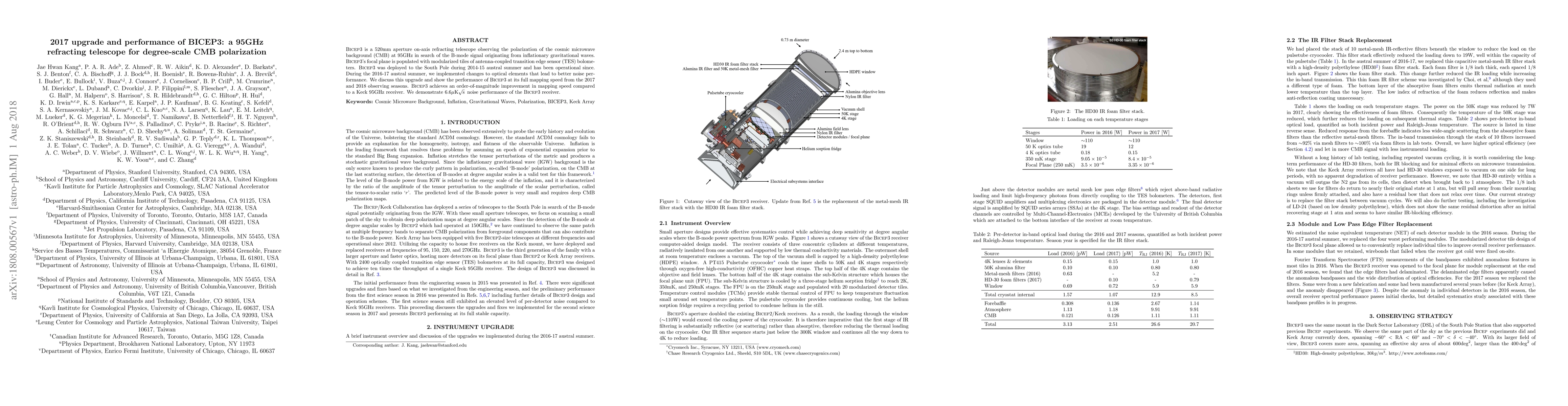 BICEP3, a 95GHz refracting telescope, was upgraded in 2016-17 to enhance noise performance and mapping speed, achieving an order-of-magnitude improvement over previous systems. The 2017 and 2018 observing seasons demonstrated a noise performance of $6.6\mu K\sqrt{s}$.