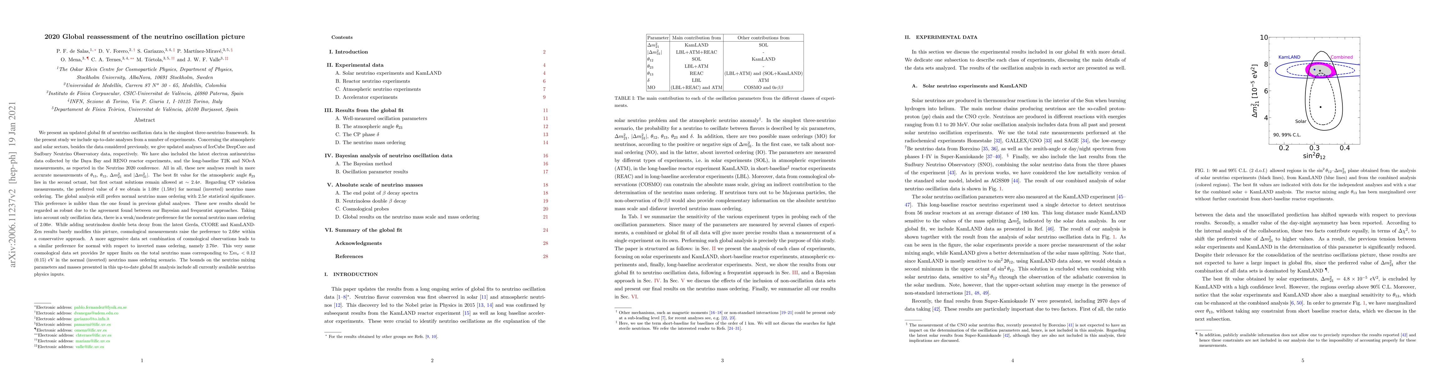 We present an updated global fit of neutrino oscillation data in the simplest three-neutrino framework. In the present study we include up-to-date analyses from a number of experiments. Concerning the atmospheric and solar sectors, we give updated analyses of DeepCore and SNO data, respectively. We have also included the latest electron antineutrino data collected by the Daya Bay and RENO reactor experiments, and the long-baseline T2K and NO$\nu$A measurements. These new analyses result in more accurate measurements of $\theta_{13}$, $\theta_{12}$, $\Delta m_{21}^2$ and $|\Delta m_{31}^2|$. The best fit value for the atmospheric angle $\theta_{23}$ lies in the second octant, but first octant solutions remain allowed at $\sim2.4\sigma$. Regarding CP violation measurements, the preferred value of $\delta$ we obtain is 1.08$\pi$ (1.58$\pi$) for normal (inverted) neutrino mass ordering. The global analysis prefers normal neutrino mass ordering with 2.5$\sigma$. This preference is milder than the one found in previous global analyses. The new results should be regarded as robust due to the agreement found between our Bayesian and frequentist approaches. Taking into account only oscillation data, there is a weak/moderate preference for the normal neutrino mass ordering of $2.00\sigma$. While adding neutrinoless double beta decay from the latest Gerda, CUORE and KamLAND-Zen results barely modifies this picture, cosmological measurements raise the preference to $2.68\sigma$ within a conservative approach. A more aggressive data set combination of cosmological observations leads to a similar preference, namely $2.70\sigma$. This very same cosmological data set provides $2\sigma$ upper limits on the total neutrino mass corresponding to $\sum\nu<0.12$ ($0.15$)~eV for normal (inverted) neutrino mass ordering.