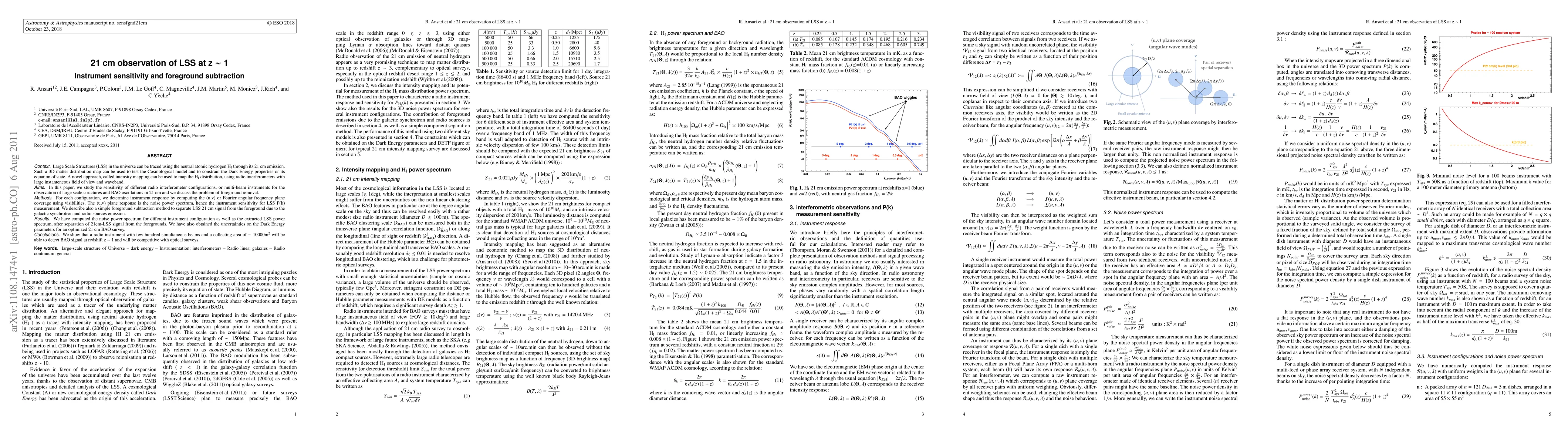 Large Scale Structures (LSS) in the universe can be traced using the neutral atomic hydrogen HI through its 21cm emission. Such a 3D matter distribution map can be used to test the Cosmological model and to constrain the Dark Energy properties or its equation of state. A novel approach, called intensity mapping can be used to map the HI distribution, using radio interferometers with large instantaneous field of view and waveband. In this paper, we study the sensitivity of different radio interferometer configurations, or multi-beam instruments for the observation of large scale structures and BAO oscillations in 21cm and we discuss the problem of foreground removal. For each configuration, we determine instrument response by computing the (u,v) or Fourier angular frequency plane coverage using visibilities. The (u,v) plane response is the noise power spectrum, hence the instrument sensitivity for LSS P(k) measurement. We describe also a simple foreground subtraction method to separate LSS 21 cm signal from the foreground due to the galactic synchrotron and radio sources emission. We have computed the noise power spectrum for different instrument configuration as well as the extracted LSS power spectrum, after separation of 21cm-LSS signal from the foregrounds. We have also obtained the uncertainties on the Dark Energy parameters for an optimized 21 cm BAO survey. We show that a radio instrument with few hundred simultaneous beams and a collecting area of ~10000 m^2 will be able to detect BAO signal at redshift z ~ 1 and will be competitive with optical surveys.