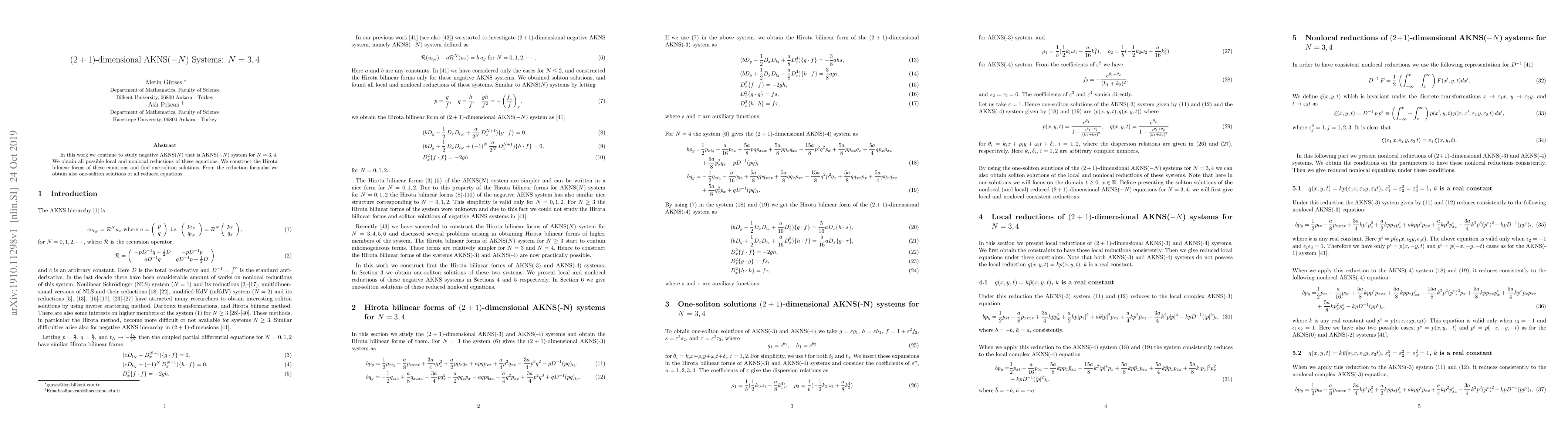 This paper investigates the $(2+1)$-dimensional negative AKNS systems for $N=3,4$, deriving all local and nonlocal reductions. It constructs Hirota bilinear forms and finds one-soliton solutions, also obtaining one-soliton solutions for the reduced equations from the derived reduction formulas.