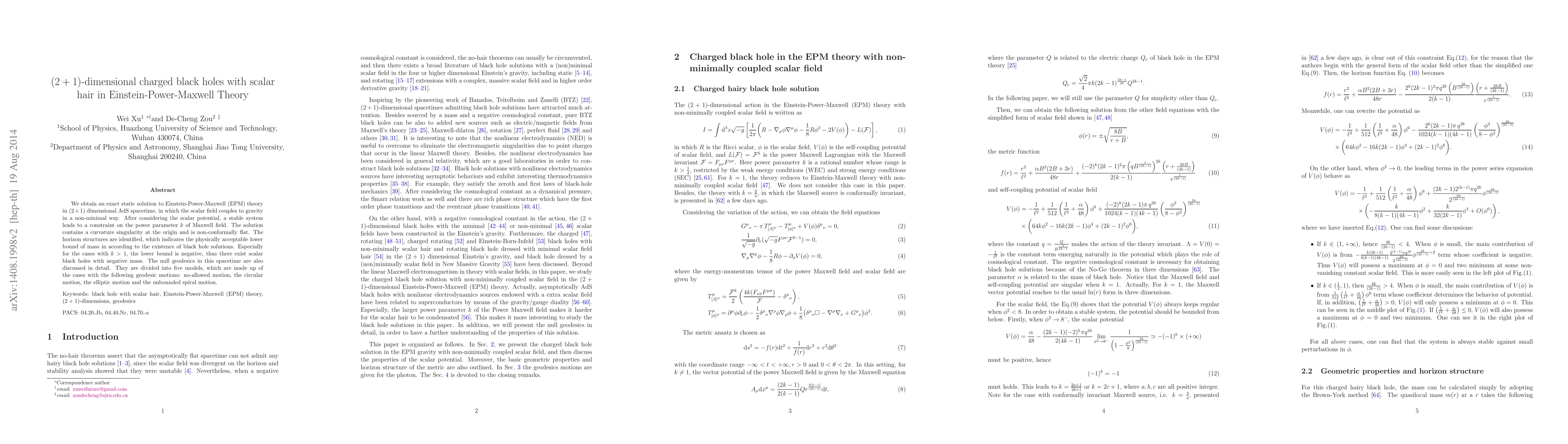 We obtain an exact static solution to Einstein-Power-Maxwell (EPM) theory in $(2+1)$ dimensional AdS spacetime, in which the scalar field couples to gravity in a non-minimal way. After considering the scalar potential, a stable system leads to a constraint on the power parameter $k$ of Maxwell field. The solution contains a curvature singularity at the origin and is non-conformally flat. The horizon structures are identified, which indicates the physically acceptable lower bound of mass in according to the existence of black hole solutions. Especially for the cases with $k>1$, the lower bound is negative, thus there exist scalar black holes with negative mass. The null geodesics in this spacetime are also discussed in detail. They are divided into five models, which are made up of the cases with the following geodesic motions: no-allowed motion, the circular motion, the elliptic motion and the unbounded spiral motion.