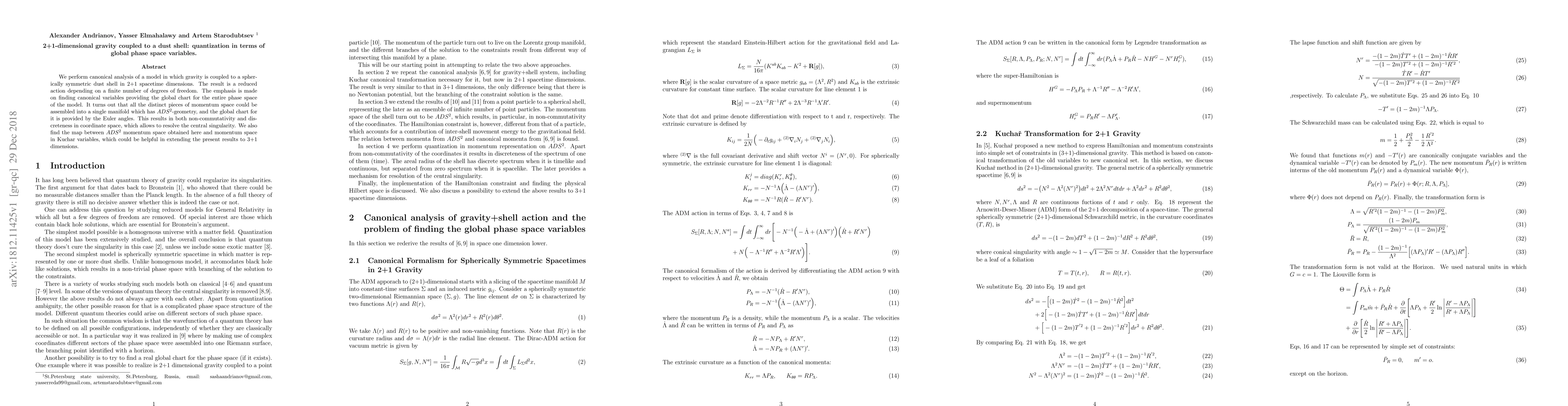 We perform canonical analysis of a model in which gravity is coupled to a spherically symmetric dust shell in 2+1 spacetime dimensions. The result is a reduced action depending on a finite number of degrees of freedom. The emphasis is made on finding canonical variables providing the global chart for the entire phase space of the model. It turns out that all the distinct pieces of momentum space could be assembled into a single manifold which has ADS^{2}-geometry, and the global chart for it is provided by the Euler angles. This results in both non-commutativity and discreteness in coordinate space, which allows to resolve the central singularity. We also find the map between ADS^{2} momentum space obtained here and momentum space in Kuchar variables, which could be helpful in extending the present results to 3+1 dimensions.