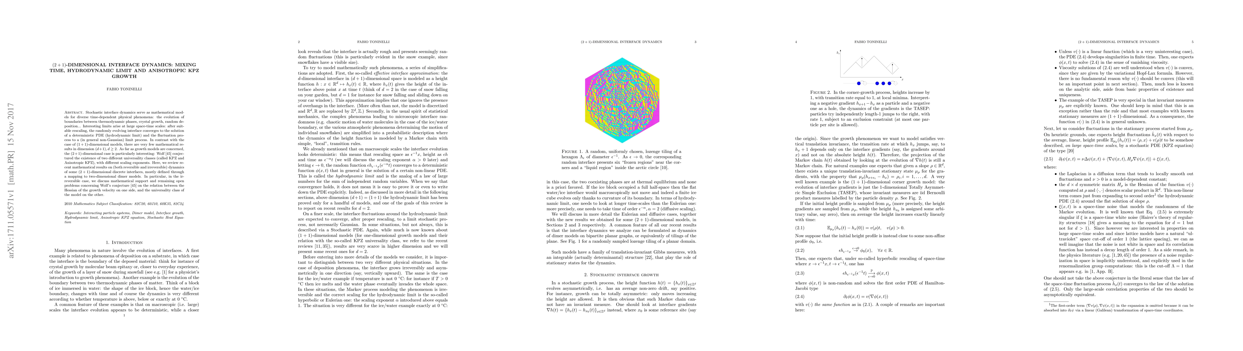 Stochastic interface dynamics serve as mathematical models for diverse time-dependent physical phenomena: the evolution of boundaries between thermodynamic phases, crystal growth, random deposition... Interesting limits arise at large space-time scales: after suitable rescaling, the randomly evolving interface converges to the solution of a deterministic PDE (hydrodynamic limit) and the fluctuation process to a (in general non-Gaussian) limit process. In contrast with the case of $(1+1)$-dimensional models, there are very few mathematical results in dimension $(d+1), d\ge2$. As far as growth models are concerned, the $(2+1)$-dimensional case is particularly interesting: D. Wolf conjectured the existence of two different universality classes (called KPZ and Anisotropic KPZ), with different scaling exponents. Here, we review recent mathematical results on (both reversible and irreversible) dynamics of some $(2+1)$-dimensional discrete interfaces, mostly defined through a mapping to two-dimensional dimer models. In particular, in the irreversible case, we discuss mathematical support and remaining open problems concerning Wolf's conjecture on the relation between the Hessian of the growth velocity on one side, and the universality class of the model on the other.