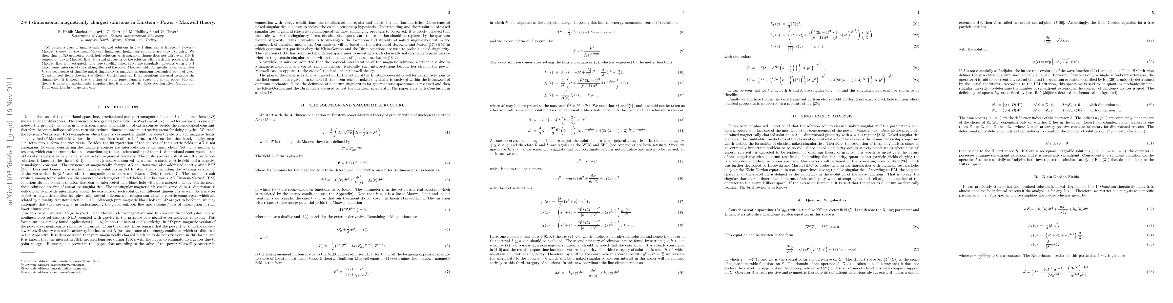 This paper explores magnetically charged solutions in 2+1 dimensional Einstein-Power-Maxwell theory, revealing that black holes with magnetic charge do not exist in 3D geometry. The study finds that a timelike naked curvature singularity develops when the power parameter k exceeds 1, and analyzes quantum mechanical implications using Klein-Gordon and Dirac fields, concluding that the static pure magnetic spacetime is quantum mechanically singular.