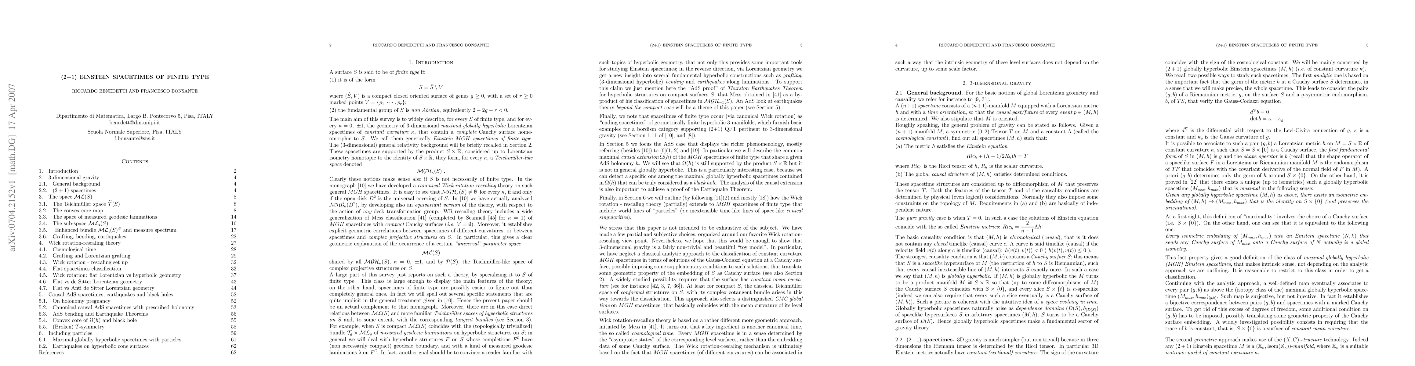 The aim of this survey is to give an overview on the geometry of Einstein maximal globally hyperbolic 2+1 spacetimes of arbitrary curvature, conatining a complete Cauchy surface of finite type. In particular a specialization to the finite type case of the canonicla Wick rotation-rescaling theory, previously developed by the authors, is provided. This includes, for arbitrary curvatures, parameterizations in terms of suitable measured geodesic laminations on open hyperbolic surfaces of finite type. The same geometric objects also parameterize complex projective structures on the surfaces. The coincidence of such parameter space is explained by means of geometric correlations between spacetimes of different curvatures and projective surfaces realized via canonical WR-rescaling along the cosmological times. We also specialize on AdS case mostly referring to recent results achieved by other authors. In particular we describe maximal causal extensions of AdS globally hyperbolic spacetimes and an AdS approach to the theory of earthquakes for hyperbolic surfaces of finite type. A general earthquake theorem is proved for the so called enhanced Teichmuller space. The case of spacetimes with conical timelike singularities is also treated.