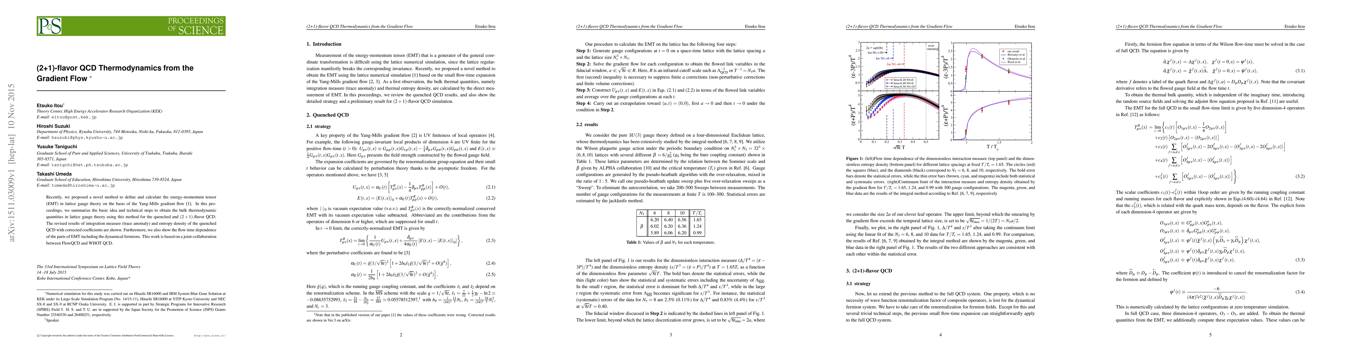 Recently, we proposed a novel method to define and calculate the energy-momentum tensor (EMT) in lattice gauge theory on the basis of the Yang-Mills gradient flow [1]. In this proceedings, we summarize the basic idea and technical steps to obtain the bulk thermodynamic quantities in lattice gauge theory using this method for the quenched and $(2+1)$-flavor QCD. The revised results of integration measure (trace anomaly) and entropy density of the quenched QCD with corrected coefficients are shown. Furthermore, we also show the flow time dependence of the parts of EMT including the dynamical fermions. This work is based on a joint-collaboration between FlowQCD and WHOT QCD.