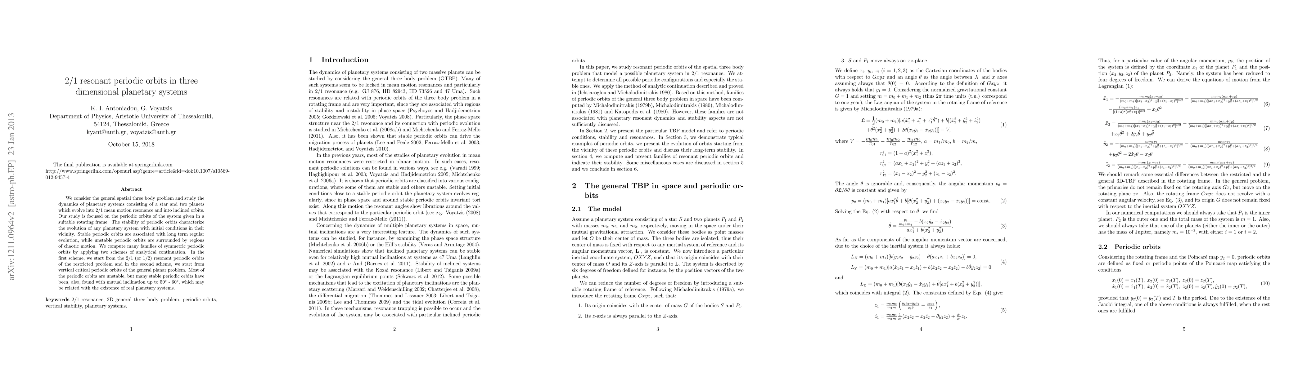 We consider the general spatial three body problem and study the dynamics of planetary systems consisting of a star and two planets which evolve into 2/1 mean motion resonance and into inclined orbits. Our study is focused on the periodic orbits of the system given in a suitable rotating frame. The stability of periodic orbits characterize the evolution of any planetary system with initial conditions in their vicinity. Stable periodic orbits are associated with long term regular evolution, while unstable periodic orbits are surrounded by regions of chaotic motion. We compute many families of symmetric periodic orbits by applying two schemes of analytical continuation. In the first scheme, we start from the 2/1 (or 1/2) resonant periodic orbits of the restricted problem and in the second scheme, we start from vertical critical periodic orbits of the general planar problem. Most of the periodic orbits are unstable, but many stable periodic orbits have been, also, found with mutual inclination up to $50^\circ$ - $60^\circ$, which may be related with the existence of real planetary systems.