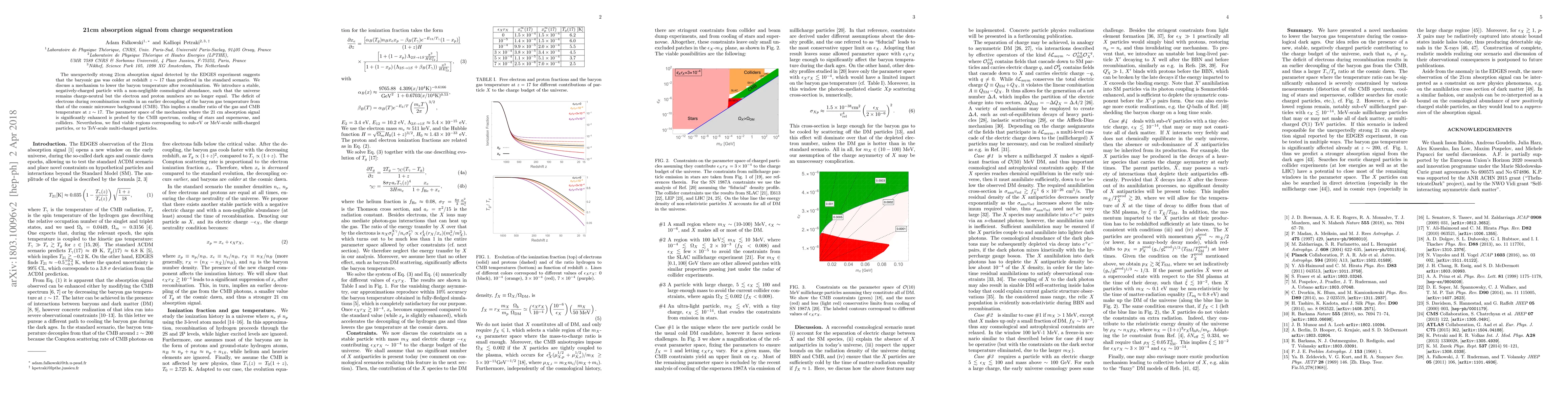 The unexpectedly strong 21cm absorption signal detected by the EDGES experiment suggests that the baryonic gas was colder at redshift $z\sim 17$ than predicted in the standard scenario. We discuss a mechanism to lower the baryon temperature after recombination. We introduce a stable, negatively-charged particle with a non-negligible cosmological abundance, such that the universe remains charge-neutral but the electron and proton numbers are no longer equal. The deficit of electrons during recombination results in an earlier decoupling of the baryon gas temperature from that of the CMB. This implies a smaller ratio of the gas and CMB temperature at $z\sim 17$. The parameter space of the mechanism where the 21 cm absorption signal is significantly enhanced is probed by the CMB spectrum, cooling of stars and supernovae, and colliders. Nevertheless, we find viable regions corresponding to sub-eV or MeV-scale milli-charged particles, or to TeV-scale multi-charged particles.