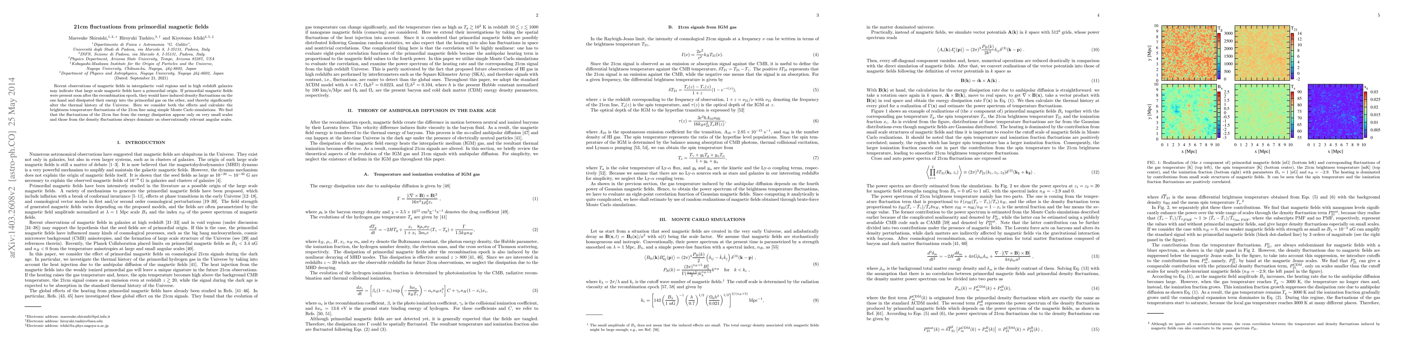 This paper investigates the potential impact of primordial magnetic fields on the thermal history of the Universe, finding that while energy dissipation from these fields induces 21cm line fluctuations on small scales, density fluctuations dominate on larger, observable scales. The study uses Monte Carlo simulations to calculate these brightness temperature fluctuations.