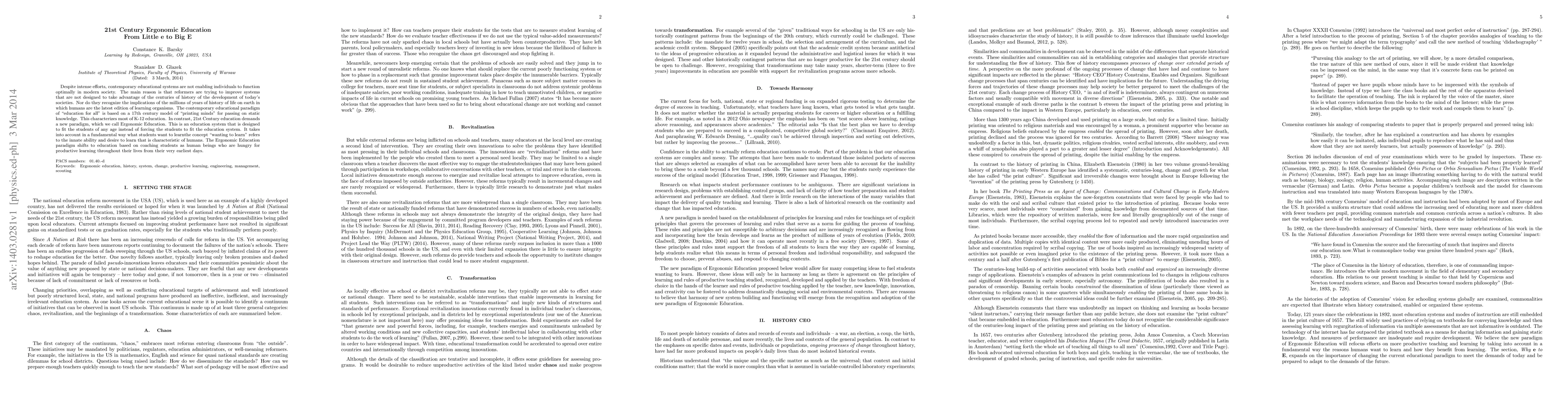 Despite intense efforts, contemporary educational systems are not enabling individuals to function optimally in modern society. The main reason is that reformers are trying to improve systems that are not designed to take advantage of the centuries of history of the development of today's societies. Nor do they recognize the implications of the millions of years of history of life on earth in which humans are the latest edition of learning organisms. The contemporary educational paradigm of "education for all" is based on a 17th century model of "printing minds" for passing on static knowledge. This characterizes most of K-12 education. In contrast, 21st Century education demands a new paradigm, which we call Ergonomic Education. This is an education system that is designed to fit the students of any age instead of forcing the students to fit the education system. It takes into account in a fundamental way what students want to learn -- the concept "wanting to learn" refers to the innate ability and desire to learn that is characteristic of humans. The Ergonomic Education paradigm shifts to education based on coaching students as human beings who are hungry for productive learning throughout their lives from their very earliest days.