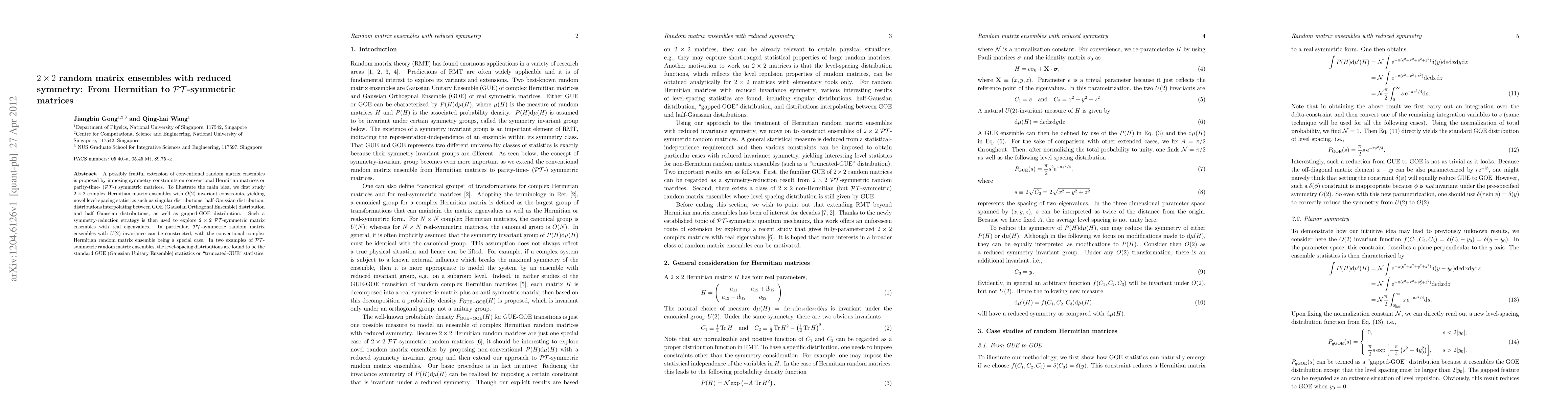 This paper explores extensions of conventional random matrix ensembles by reducing symmetry from Hermitian to PT-symmetric matrices, revealing novel level-spacing statistics and constructing PT-symmetric random matrix ensembles with U(2) invariance, including standard GUE statistics in specific cases.