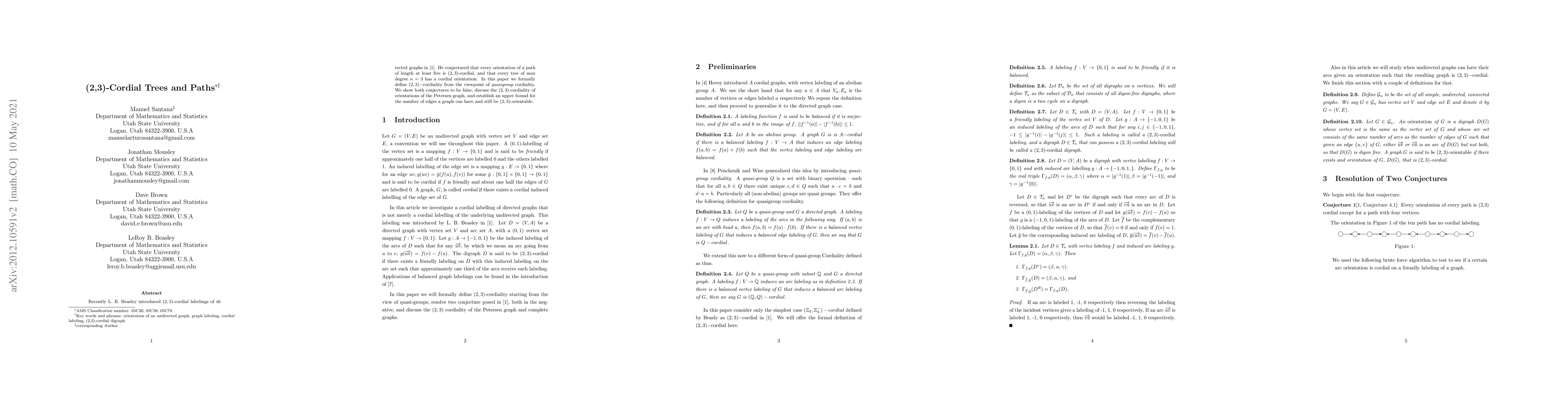 This paper refutes two conjectures by L. B. Beasley regarding $(2,3)$-cordial labelings of directed graphs: that every long path and every tree of maximum degree three are $(2,3)$ cordial. The authors also explore the $(2,3)$ cordiality of the Petersen graph and provide an upper bound on the number of edges in a $(2,3)$ cordial graph.