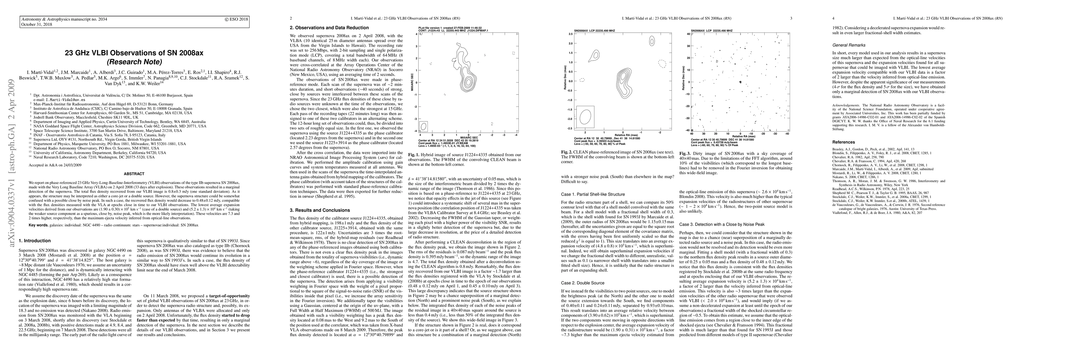 We report on phase-referenced 23 GHz Very-Long-Baseline-Interferometry (VLBI) observations of the type IIb supernova SN 2008ax, made with the Very Long Baseline Array (VLBA) on 2 April 2008 (33 days after explosion). These observations resulted in a marginal detection of the supernova. The total flux density recovered from our VLBI image is 0.8$\pm$0.3 mJy (one standard deviation). As it appears, the structure may be interpreted as either a core-jet or a double source. However, the supernova structure could be somewhat confused with a possible close by noise peak. In such a case, the recovered flux density would decrease to 0.48$\pm$0.12 mJy, compatible with the flux densities measured with the VLA at epochs close in time to our VLBI observations. The lowest average expansion velocities derived from our observations are $(1.90 \pm 0.30) \times 10^5$ km s$^{-1}$ (case of a double source) and $(5.2 \pm 1.3) \times 10^4$ km s$^{-1}$ (taking the weaker source component as a spurious, close by, noise peak, which is the more likely interpretation). These velocities are 7.3 and 2 times higher, respectively, than the maximum ejecta velocity inferred from optical-line observations.