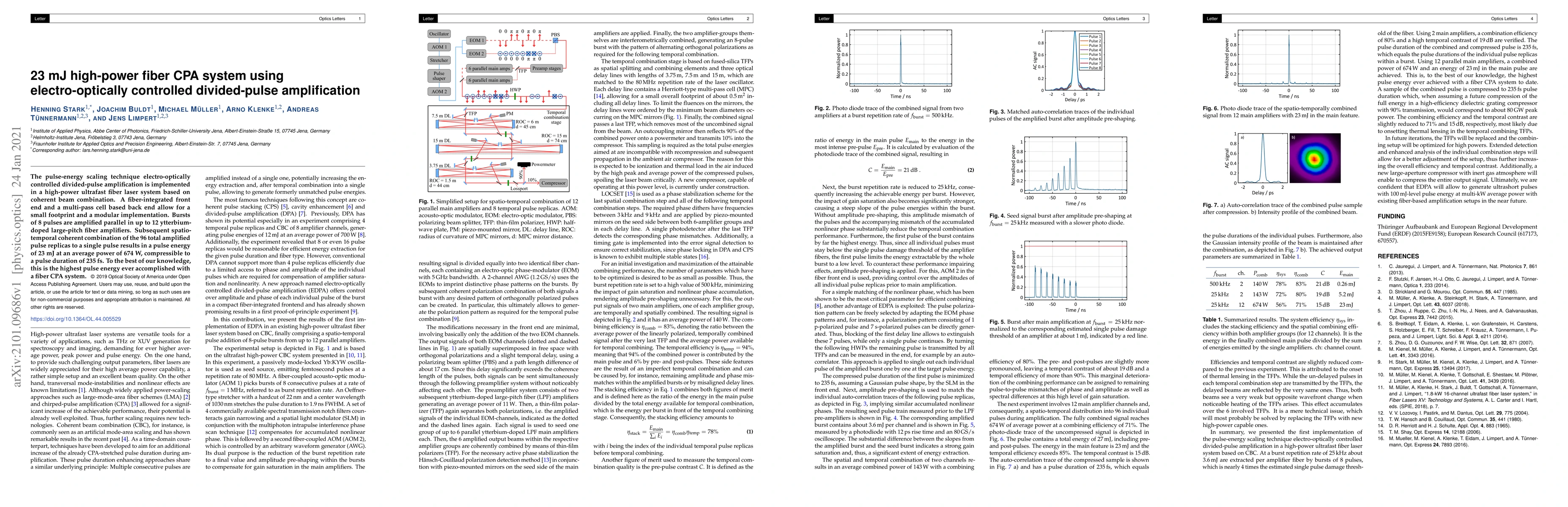 This paper describes a high-power fiber chirped pulse amplification (CPA) system achieving 23 mJ pulse energy using electro-optically controlled divided-pulse amplification, combining 96 amplified pulses to produce a single pulse with a duration of 235 fs, representing the highest pulse energy achieved in such systems.