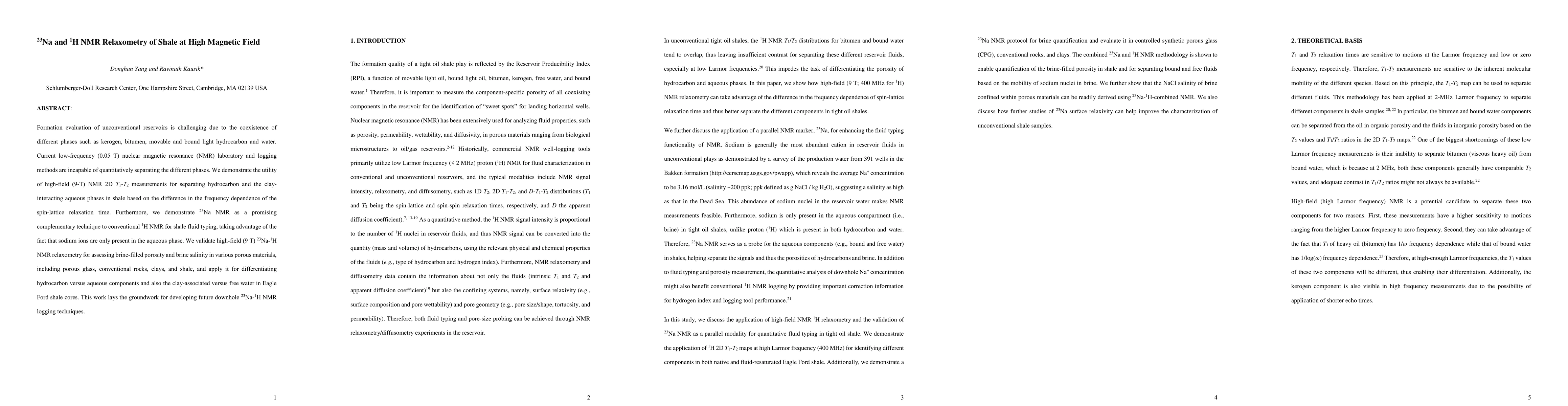 This paper demonstrates the use of high-field (9 T) NMR relaxometry, including 23Na and 1H NMR, to distinguish between hydrocarbon and aqueous phases in shale, providing a more accurate evaluation of unconventional reservoirs. The study validates the technique for assessing brine-filled porosity and salinity, and lays the groundwork for future downhole NMR logging methods.