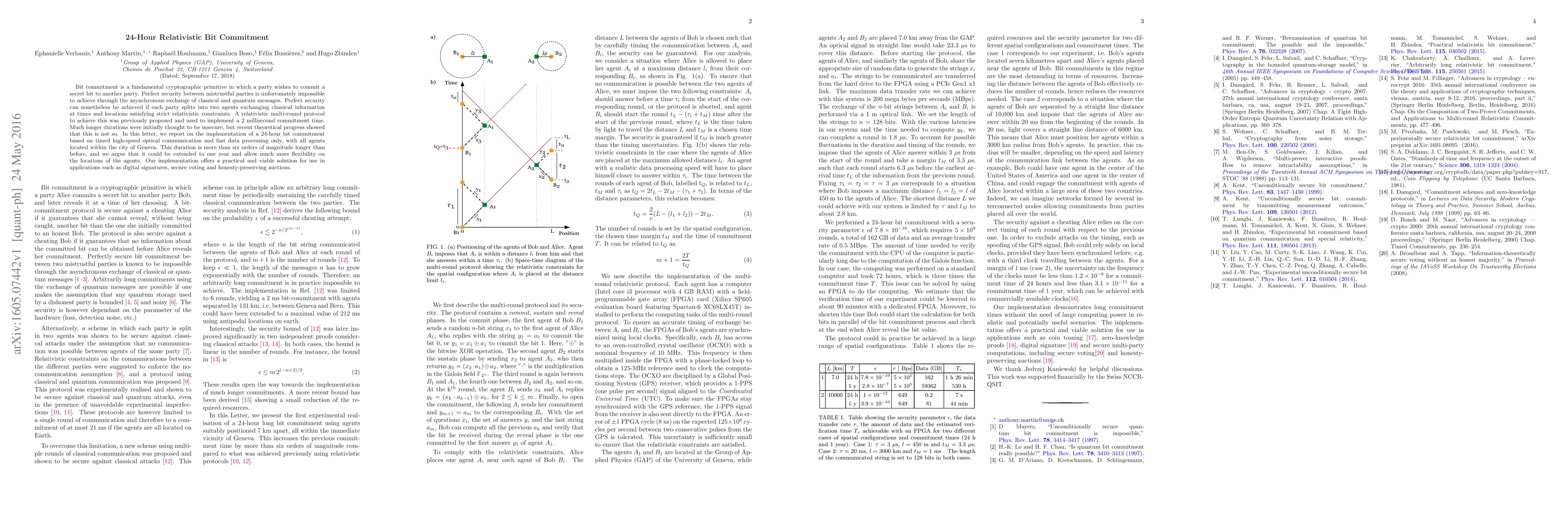 Bit commitment is a fundamental cryptographic primitive in which a party wishes to commit a secret bit to another party. Perfect security between mistrustful parties is unfortunately impossible to achieve through the asynchronous exchange of classical and quantum messages. Perfect security can nonetheless be achieved if each party splits into two agents exchanging classical information at times and locations satisfying strict relativistic constraints. A relativistic multi-round protocol to achieve this was previously proposed and used to implement a 2~millisecond commitment time. Much longer durations were initially thought to be insecure, but recent theoretical progress showed that this is not so. In this letter, we report on the implementation of a 24-hour bit commitment based on timed high-speed optical communication and fast data processing only, with all agents located within the city of Geneva. This duration is more than six orders of magnitude longer than before, and we argue that it could be extended to one year and allow much more flexibility on the locations of the agents. Our implementation offers a practical and viable solution for use in applications such as digital signatures, secure voting and honesty-preserving auctions.