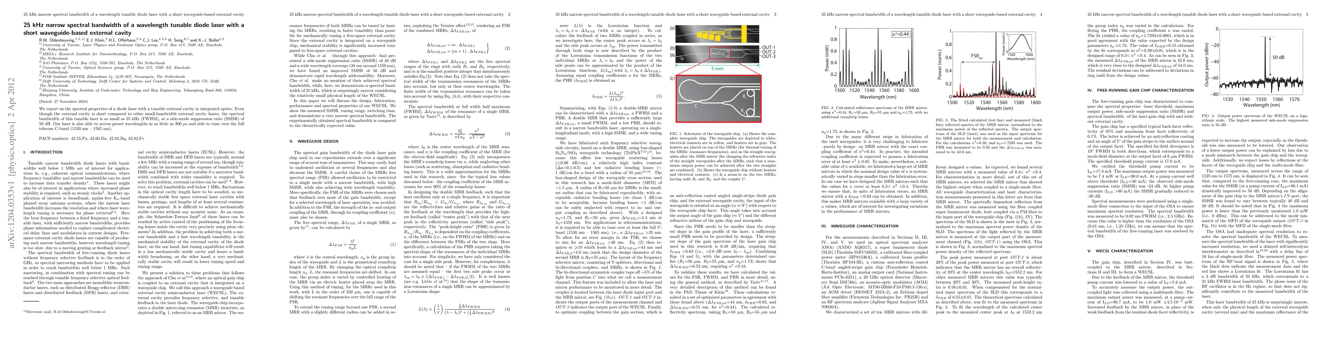 This paper describes a diode laser with a tunable external cavity that achieves a narrow spectral bandwidth of 25 kHz (FWHM) and a side-mode suppression ratio of 50 dB, while being able to tune over the telecom C-band in 200 microseconds. Despite the short waveguide-based external cavity, the laser maintains exceptional spectral properties.