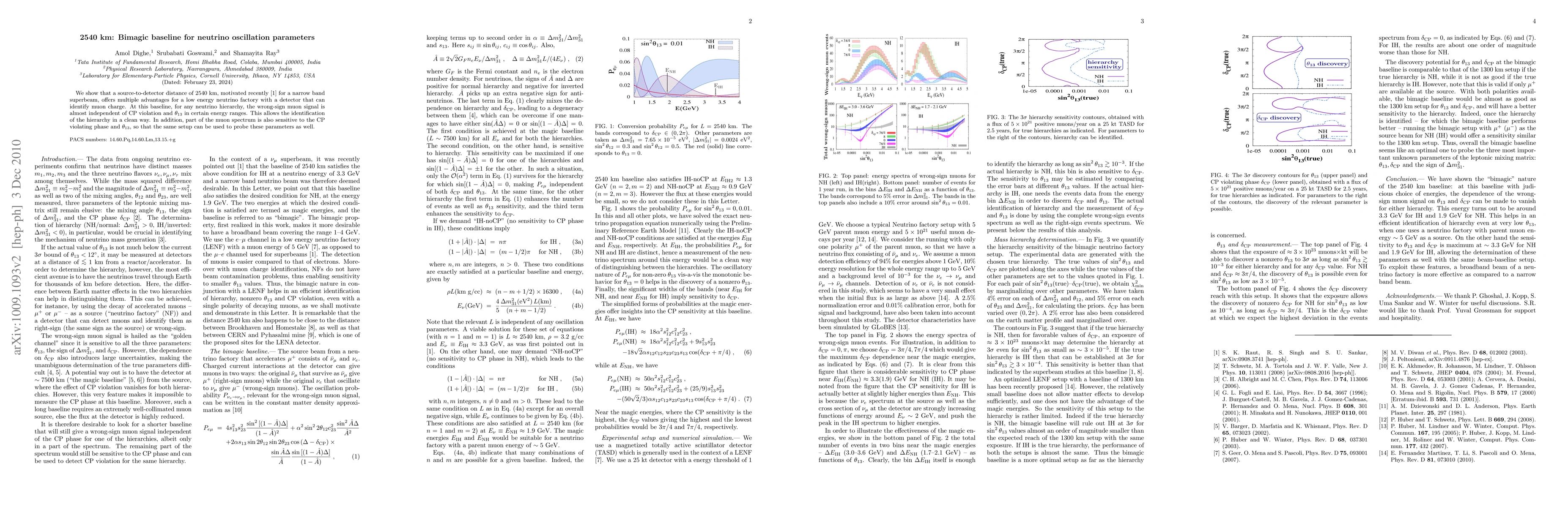 The novelty of this work lies in the identification of the 2540 km baseline as 'bimagic', capable of independently determining neutrino hierarchy and probing CP violation and θ13 in specific energy ranges, which was not previously explored in detail.