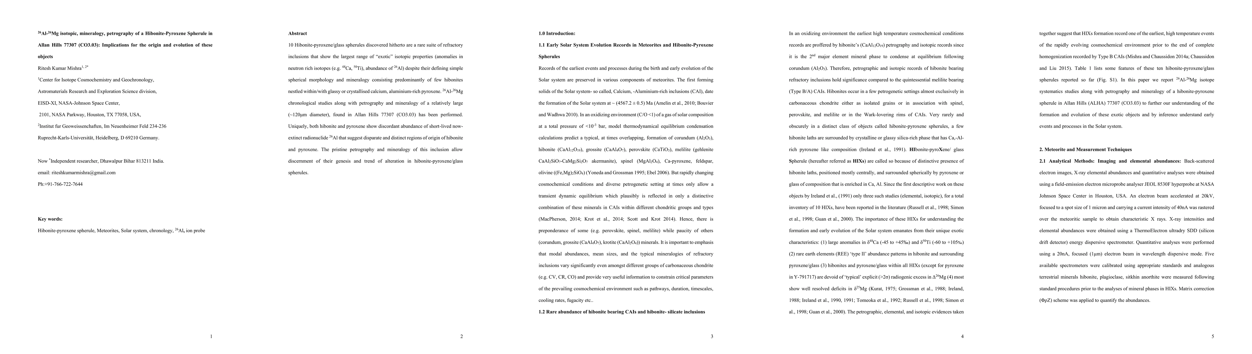 10 Hibonite-pyroxene/glass spherules discovered hitherto are a rare suite of refractory inclusions that show the largest range of exotic isotopic properties (anomalies in neutron rich isotopes (e.g., $^{48}$Ca, $^{50}$Ti), abundance of $^{26}$Al) despite their defining simple spherical morphology and mineralogy consisting predominantly of few hibonites nestled within/with glassy or crystallised calcium, aluminium-rich pyroxene. $^{26}$Al-$^{26}$Mg chronological studies along with petrography and mineralogy of a relatively large (~120 micron diameter), found in Allan Hills 77307 (CO3.03) has been performed. Uniquely, both hibonite and pyroxene show discordant abundance of short-lived now-extinct radionuclide $^{26}$Al that suggest disparate and distinct regions of origin of hibonite and pyroxene. The pristine petrography and mineralogy of this inclusion allow discernment of their genesis and trend of alteration in hibonite-pyroxene/glass spherules.