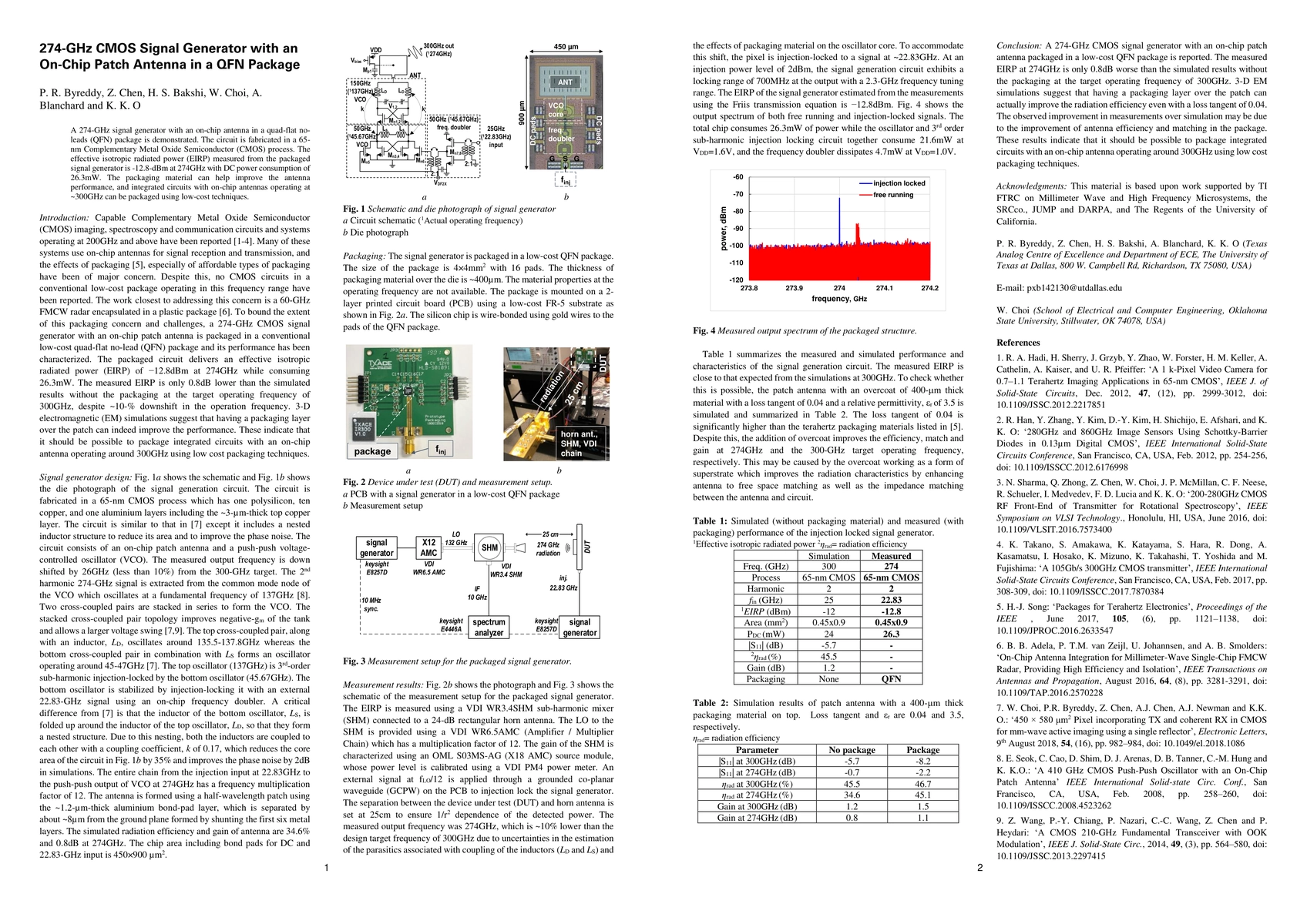 A 274-GHz signal generator with an on-chip antenna in a quad-flat no-leads (QFN) package is demonstrated. The circuit is fabricated in a 65-nm Complementary Metal Oxide Semiconductor (CMOS) process. The effective isotropic radiated power (EIRP) measured from the packaged signal generator is -12.8-dBm at 274GHz with DC power consumption of 26.3mW. The packaging material can help improve the antenna performance, and integrated circuits with on-chip antennas operating at ~300GHz can be packaged using low-cost techniques.