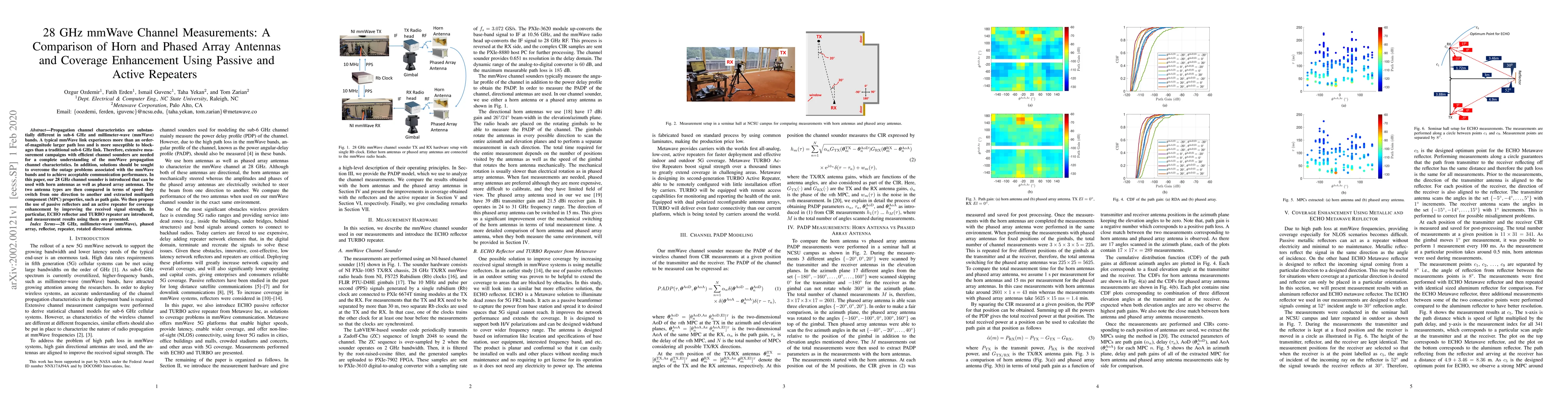 This paper compares horn and phased array antennas for 28 GHz mmWave channel measurements, focusing on their switching speed and multipath component properties. It also proposes using passive reflectors and an active repeater to enhance coverage and improve signal strength.