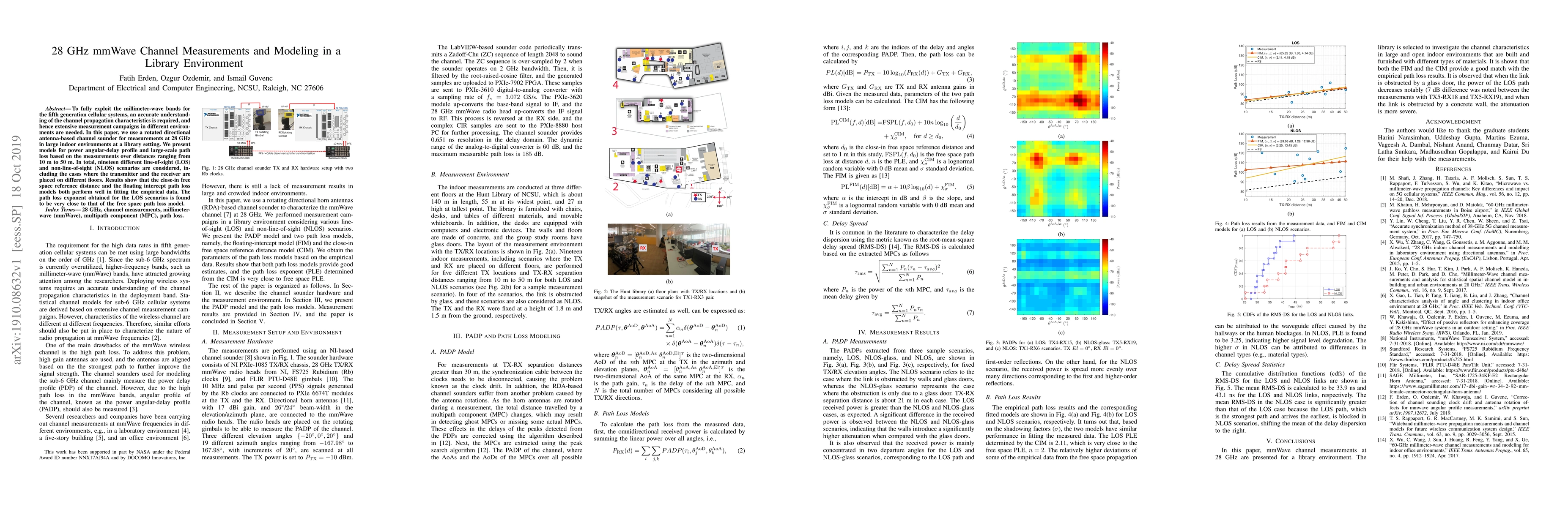 This paper measures 28 GHz mmWave channel propagation in a library setting using a directional antenna-based sounder, presenting models for power angular-delay profile and path loss. Results indicate that both the close-in free space and floating intercept path loss models fit empirical data well, with a path loss exponent close to free space for line-of-sight scenarios.