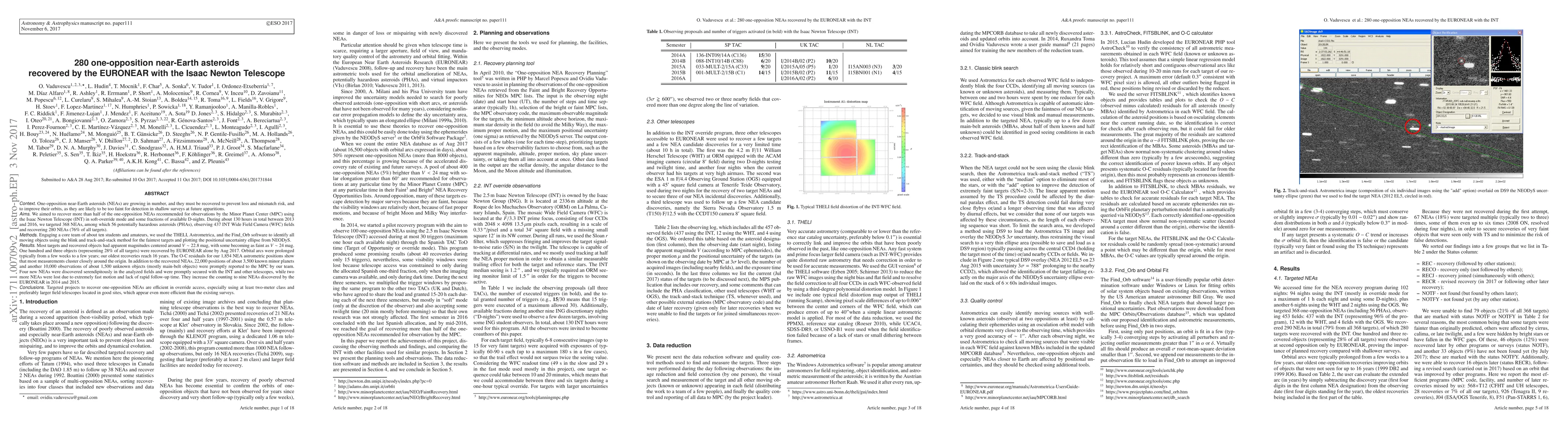 The EURONEAR project successfully recovered 280 one-opposition near-Earth asteroids (NEAs) using the Isaac Newton Telescope, improving their orbits and reducing risk. The team also discovered four new NEAs and reported 22,000 positions of known minor planets.