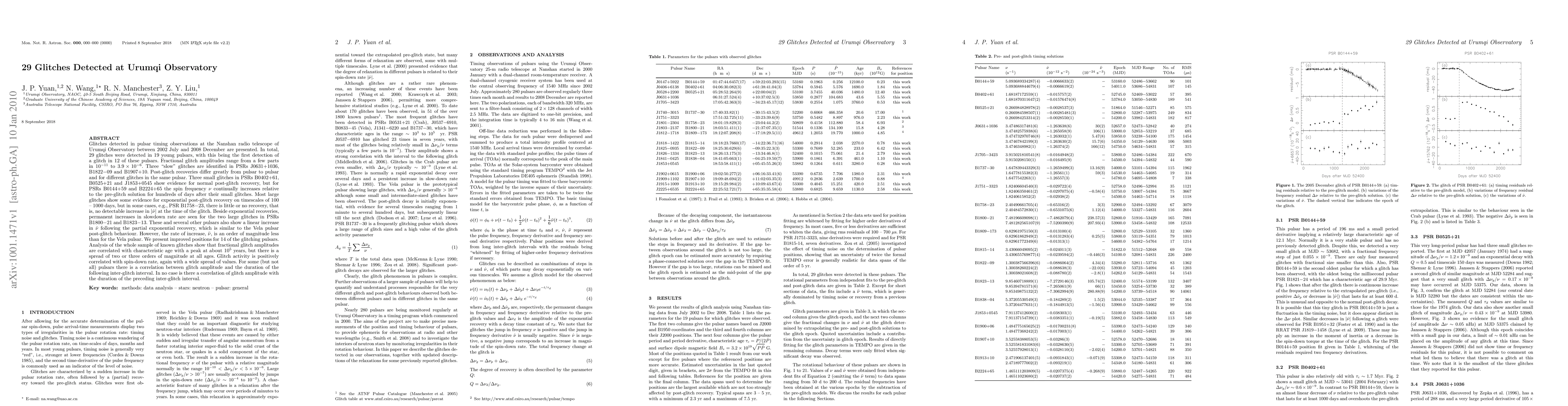 The study at Urumqi Observatory detected 29 glitches in 19 young pulsars using the Nanshan radio telescope from 2002 to 2008. Notable findings include varied post-glitch recovery patterns, exponential recovery on timescales of 100-1000 days in many large glitches, and permanent increases in slowdown rate in certain pulsars. The research also highlights a correlation between fractional glitch amplitudes and pulsar characteristic age, along with glitch activity and spin-down rate.
