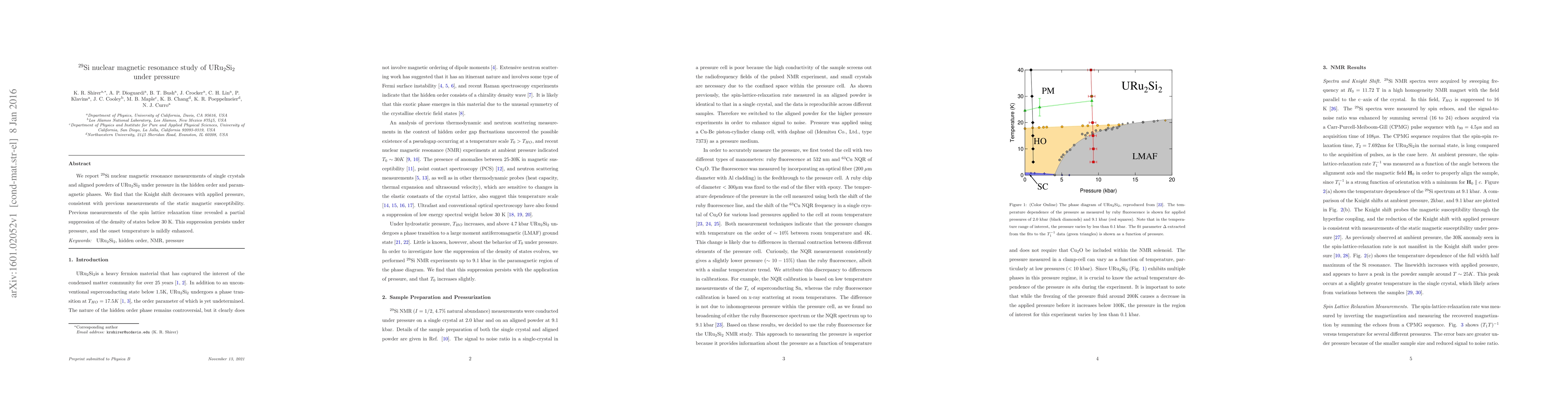 This study investigates 29Si nuclear magnetic resonance in URu2Si2 under pressure, revealing a decrease in Knight shift with increasing pressure, aligning with magnetic susceptibility trends. The suppression of the density of states below 30 K persists under pressure, with a slight increase in the onset temperature.