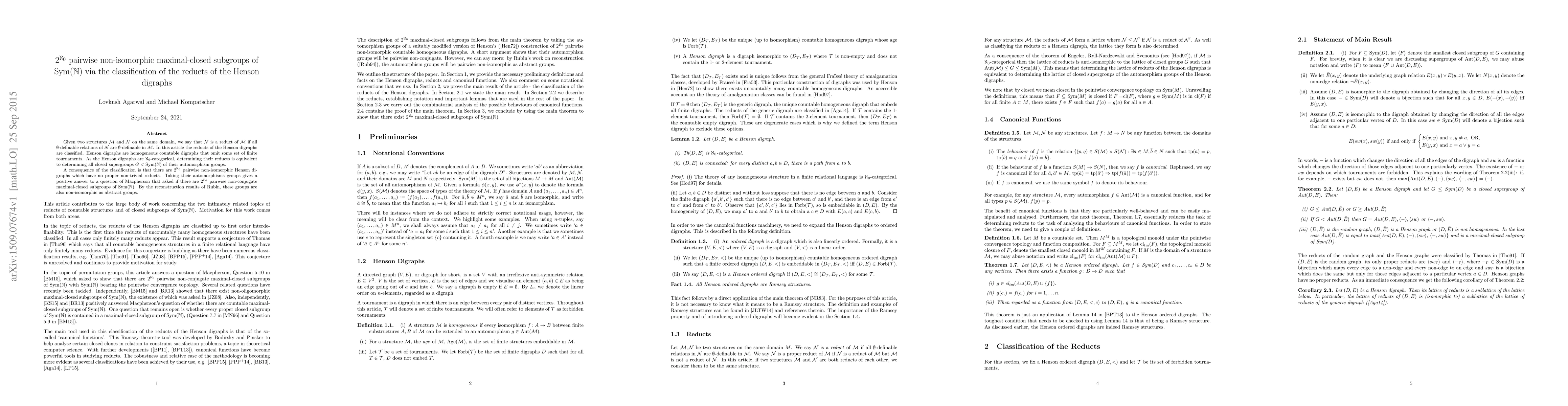 This paper classifies the reducts of the Henson digraphs, revealing $2^{\aleph_0}$ pairwise non-isomorphic maximal-closed subgroups of Sym$(\mathbb{N})$. The classification answers Macpherson's question on the existence of such subgroups, showing they are also non-isomorphic as abstract groups.