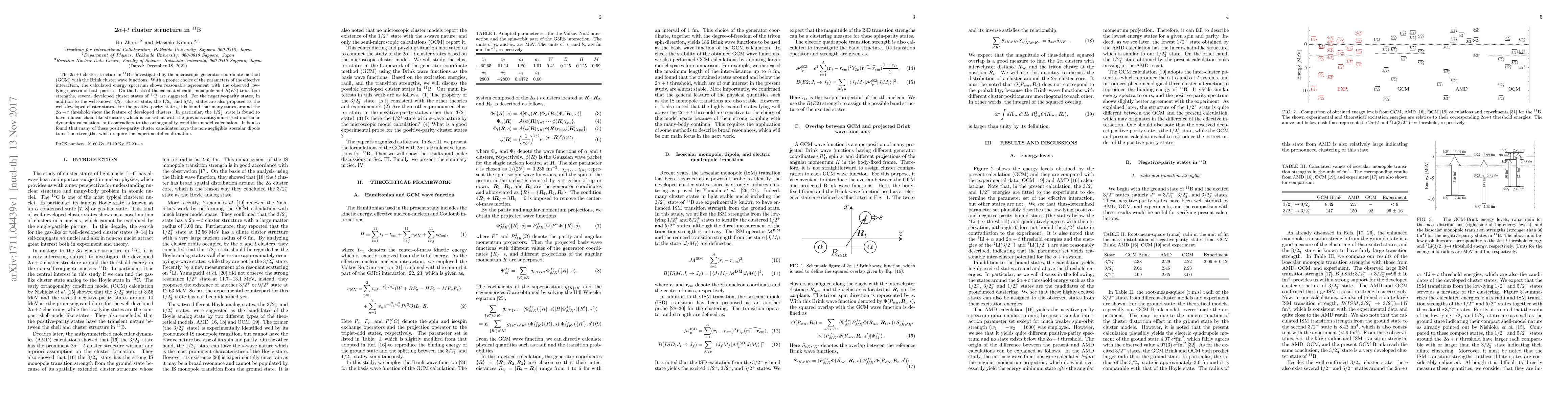 Researchers used a microscopic generator coordinate method to study the 2$eta$+$t$ cluster structure in $^{11}$B, proposing several developed cluster states and suggesting experimental confirmation for their isoscalar transition strengths.