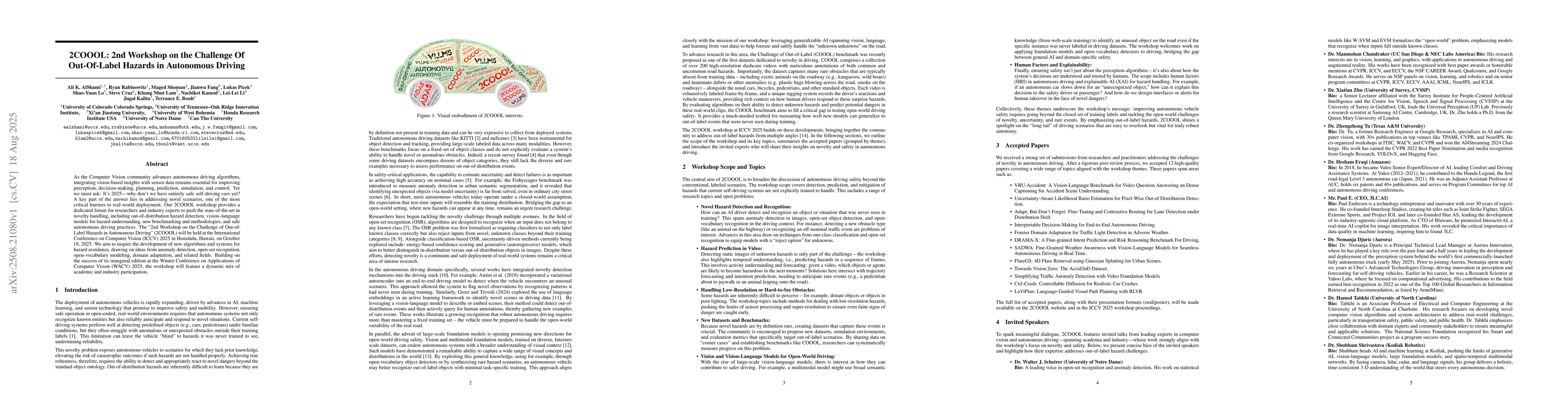 As the computer vision community advances autonomous driving algorithms, integrating vision-based insights with sensor data remains essential for improving perception, decision making, planning, prediction, simulation, and control. Yet we must ask: Why don't we have entirely safe self-driving cars yet? A key part of the answer lies in addressing novel scenarios, one of the most critical barriers to real-world deployment. Our 2COOOL workshop provides a dedicated forum for researchers and industry experts to push the state of the art in novelty handling, including out-of-distribution hazard detection, vision-language models for hazard understanding, new benchmarking and methodologies, and safe autonomous driving practices. The 2nd Workshop on the Challenge of Out-of-Label Hazards in Autonomous Driving (2COOOL) will be held at the International Conference on Computer Vision (ICCV) 2025 in Honolulu, Hawaii, on October 19, 2025. We aim to inspire the development of new algorithms and systems for hazard avoidance, drawing on ideas from anomaly detection, open-set recognition, open-vocabulary modeling, domain adaptation, and related fields. Building on the success of its inaugural edition at the Winter Conference on Applications of Computer Vision (WACV) 2025, the workshop will feature a mix of academic and industry participation.