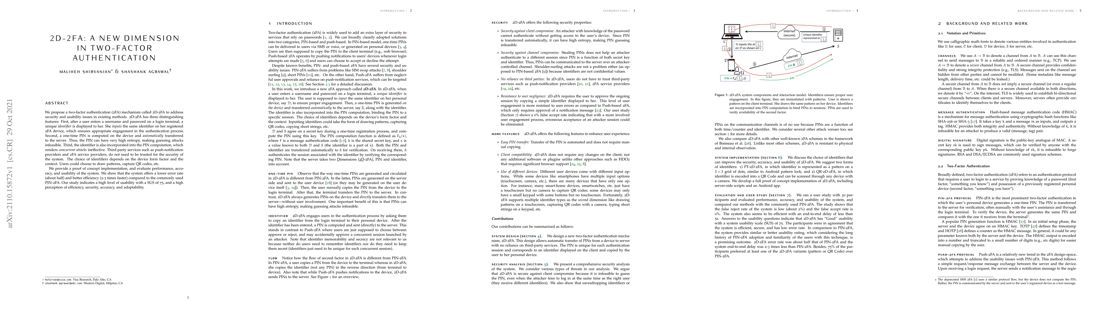 The 2D-2FA mechanism introduces a novel two-factor authentication method that enhances security and usability by requiring users to input a unique identifier on their 2FA device, compute a high-entropy one-time PIN, and incorporate the identifier into the PIN computation to thwart concurrent attacks. The system demonstrates improved performance, lower error rates, and higher user satisfaction compared to traditional PIN-based 2FA.