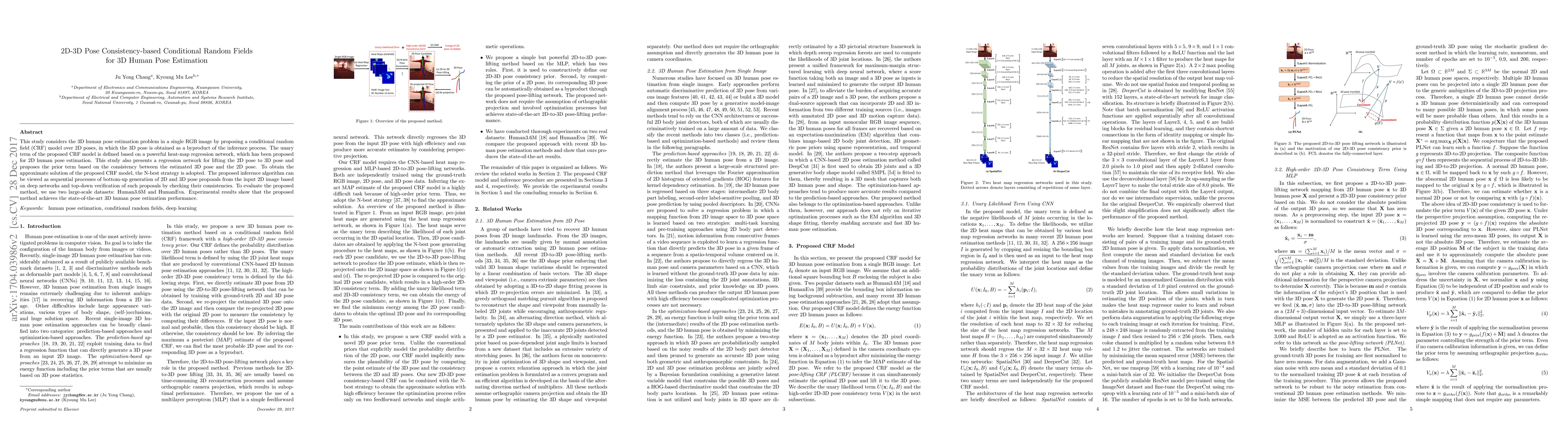 This paper proposes a conditional random field (CRF) model for 3D human pose estimation in RGB images, utilizing a heat-map regression network for 2D pose estimation and a regression network to lift 2D to 3D poses, emphasizing consistency between both. The method achieves state-of-the-art performance on Human3.6M and HumanEva datasets.