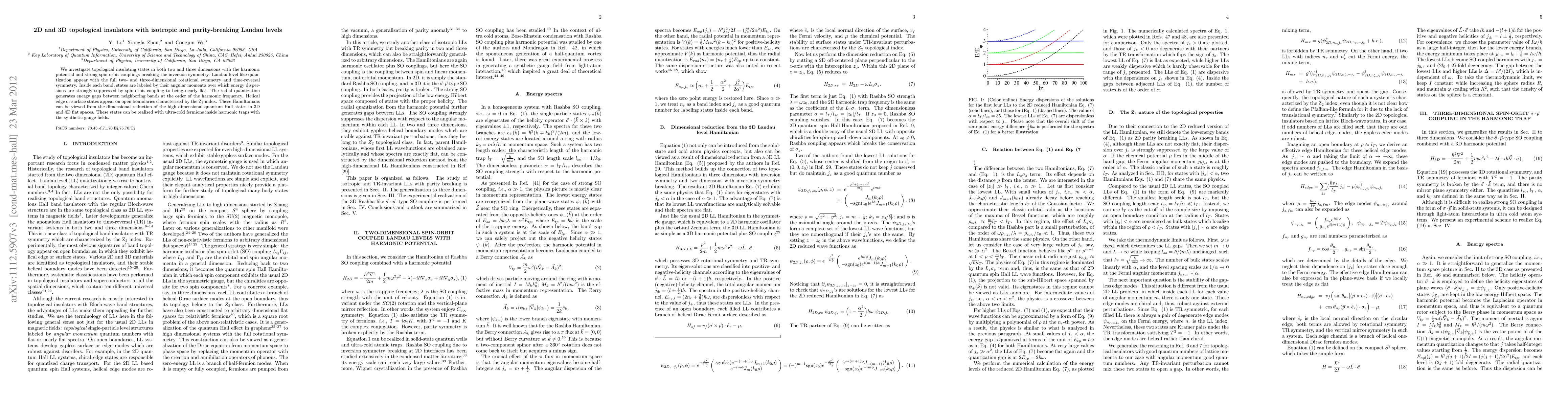 We investigate topological insulating states in both two and three dimensions with the harmonic potential and strong spin-orbit couplings breaking the inversion symmetry. Landau-level like quantizations appear with the full 2D and 3D rotational symmetry and time-reversal symmetry. Inside each band, states are labeled by their angular momenta over which energy dispersions are strongly suppressed by spin-orbit coupling to nearly flat. The radial quantization generates energy gaps between neighboring bands at the order of the harmonic frequency. Helical edge or surface states appear on open boundaries characterized by the Z2 index. These Hamiltonians can be viewed from the dimensional reduction of the high dimensional quantum Hall states in 3D and 4D flat spaces. These states can be realized with ultra-cold fermions inside harmonic traps with the synthetic gauge fields.