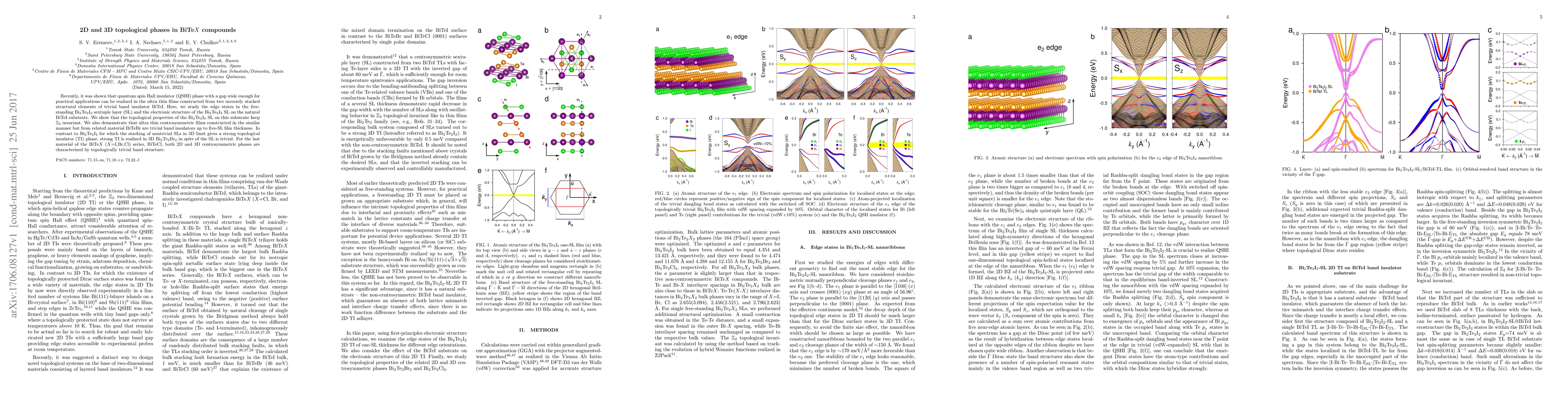 Recently, it was shown that quantum spin Hall insulator (QSHI) phase with a gap wide enough for practical applications can be realized in the ultra thin films constructed from two inversely stacked structural elements of trivial band insulator BiTeI. Here, we study the edge states in the free-standing Bi$_2$Te$_2$I$_2$ sextuple layer (SL) and the electronic structure of the Bi$_2$Te$_2$I$_2$ SL on the natural BiTeI substrate. We show that the topological properties of the Bi$_2$Te$_2$I$_2$ SL on this substrate keep $\mathbb Z_2$ invariant. We also demonstrate that ultra thin centrosymmetric films constructed in the similar manner but from related material BiTeBr are trivial band insulators up to five-SL film thickness. In contrast to Bi$_2$Te$_2$I$_2$ for which the stacking of nontrivial SLs in 3D limit gives a strong topological insulator (TI) phase, strong TI is realized in 3D Bi$_2$Te$_2$Br$_2$ in spite of the SL is trivial. For the last material of the BiTe$X$ ($X$=I,Br,Cl) series, BiTeCl, both 2D and 3D centrosymmetric phases are characterized by topologically trivial band structure.