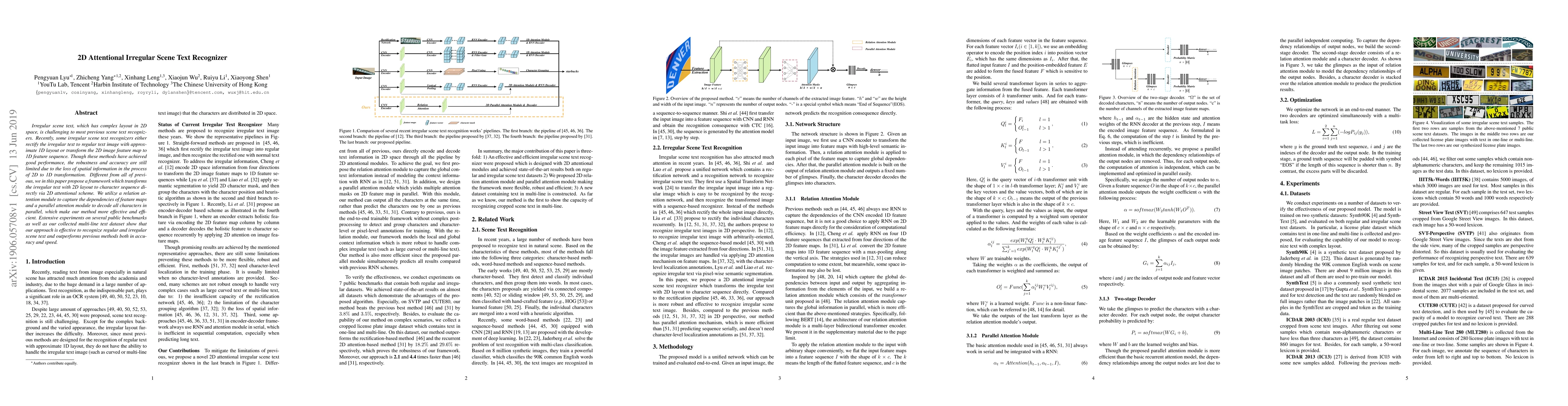 This paper proposes a 2D attentional framework for recognizing irregular scene text by directly transforming 2D layout to character sequences using a relation and parallel attention modules, achieving better accuracy and speed compared to previous methods. Experiments on public benchmarks and a new multi-line text dataset demonstrate its effectiveness.