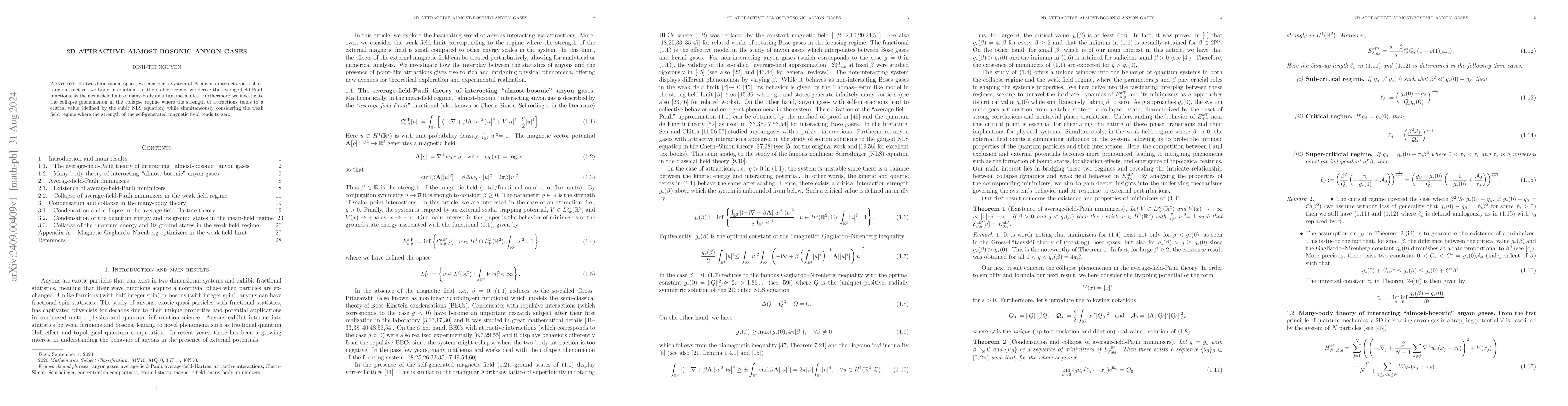 This paper explores a system of 2D anyons with short-range attractive interactions, deriving the average-field Pauli functional in the stable regime. It also examines the collapse phenomenon when attraction approaches a critical strength linked to the cubic NLS equation, while the self-generated magnetic field strength diminishes.