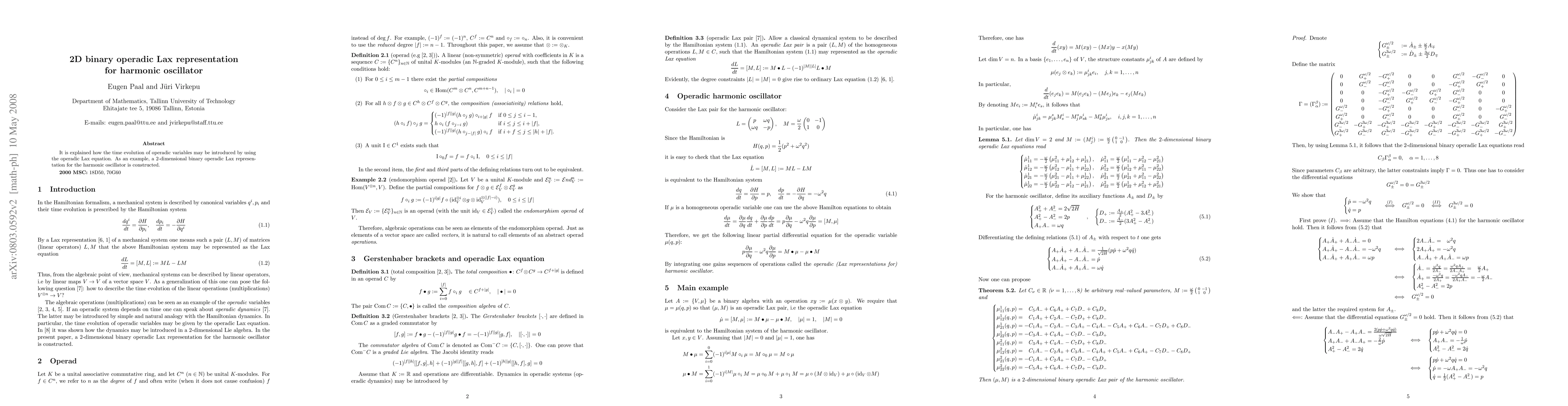 Summary: The paper explores the introduction of time evolution in operadic variables via the operadic Lax equation, demonstrating this through a constructed 2-dimensional binary operadic Lax representation for a harmonic oscillator model.