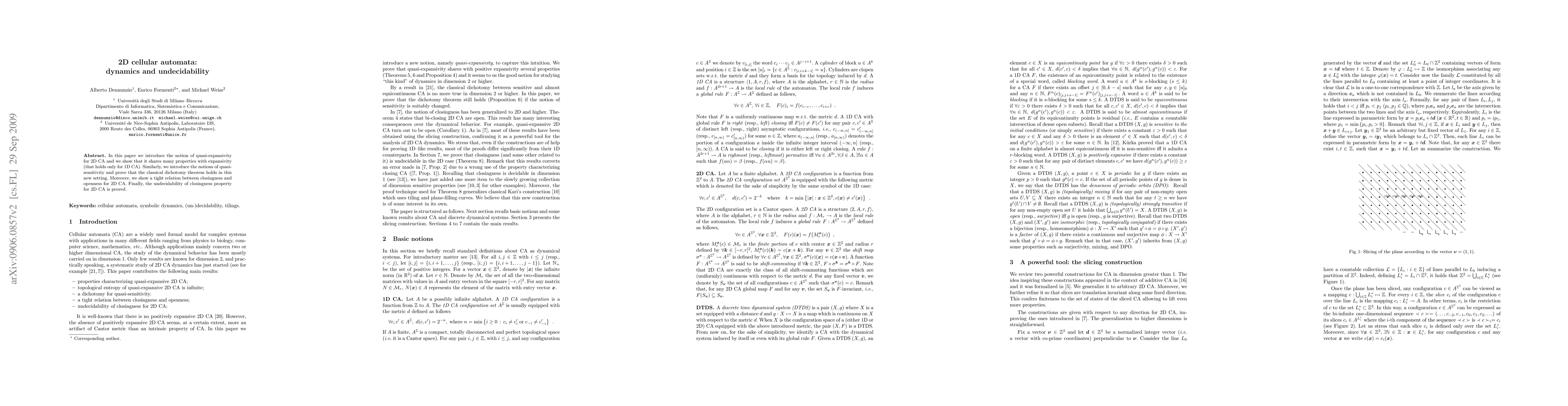 This paper explores quasi-expansivity, quasi-sensitivity, and the classical dichotomy theorem for 2D cellular automata (CA), demonstrating their properties akin to 1D CA. It also proves the undecidability of the closingness property for 2D CA.