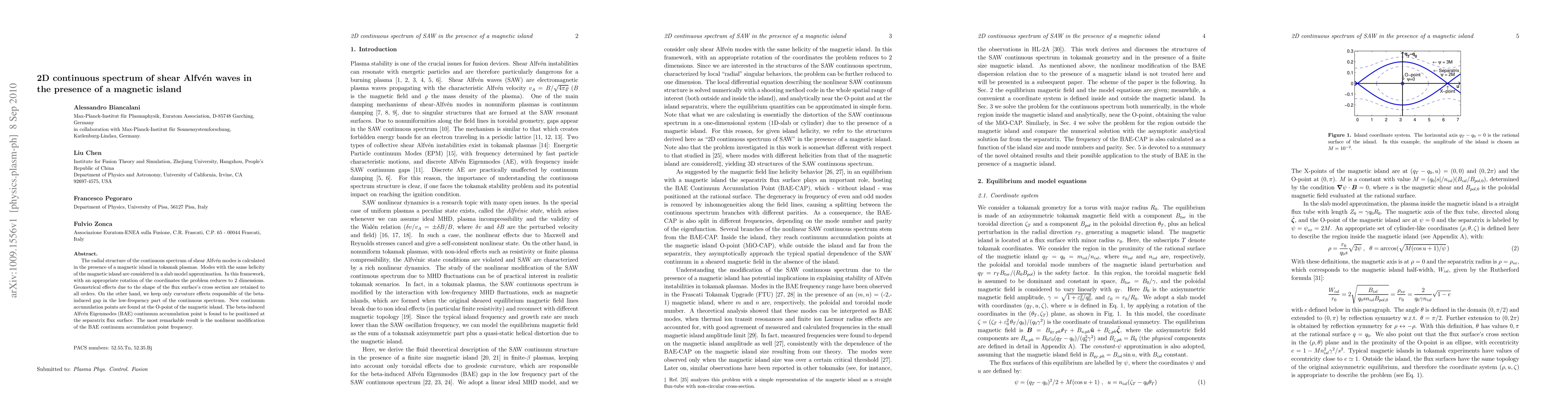 The paper presents a detailed analysis of the 2D continuous spectrum of shear Alfvén waves in the presence of a magnetic island, including modifications to the BAE continuum accumulation point frequency due to the island's nonlinear effects.