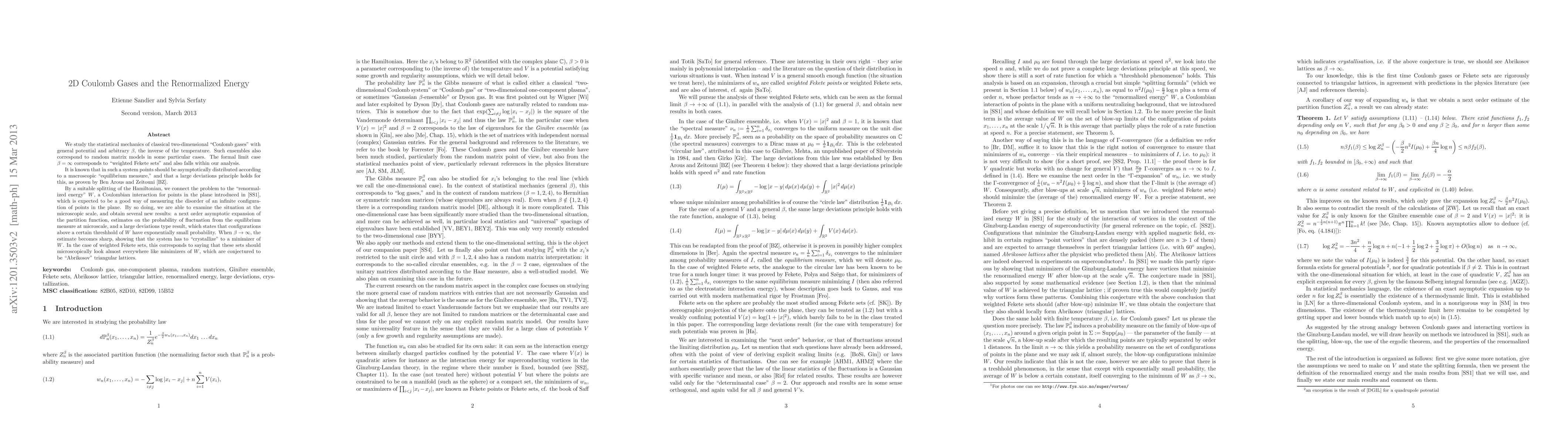We study the statistical mechanics of classical two-dimensional "Coulomb gases" with general potential and arbitrary \beta, the inverse of the temperature. Such ensembles also correspond to random matrix models in some particular cases. The formal limit case \beta=\infty corresponds to "weighted Fekete sets" and also falls within our analysis. It is known that in such a system points should be asymptotically distributed according to a macroscopic "equilibrium measure," and that a large deviations principle holds for this, as proven by Ben Arous and Zeitouni. By a suitable splitting of the Hamiltonian, we connect the problem to the "renormalized energy" W, a Coulombian interaction for points in the plane introduced in our prior work, which is expected to be a good way of measuring the disorder of an infinite configuration of points in the plane. By so doing, we are able to examine the situation at the microscopic scale, and obtain several new results: a next order asymptotic expansion of the partition function, estimates on the probability of fluctuation from the equilibrium measure at microscale, and a large deviations type result, which states that configurations above a certain threshhold of W have exponentially small probability. When \beta\to \infty, the estimate becomes sharp, showing that the system has to "crystallize" to a minimizer of W. In the case of weighted Fekete sets, this corresponds to saying that these sets should microscopically look almost everywhere like minimizers of W, which are conjectured to be "Abrikosov" triangular lattices.