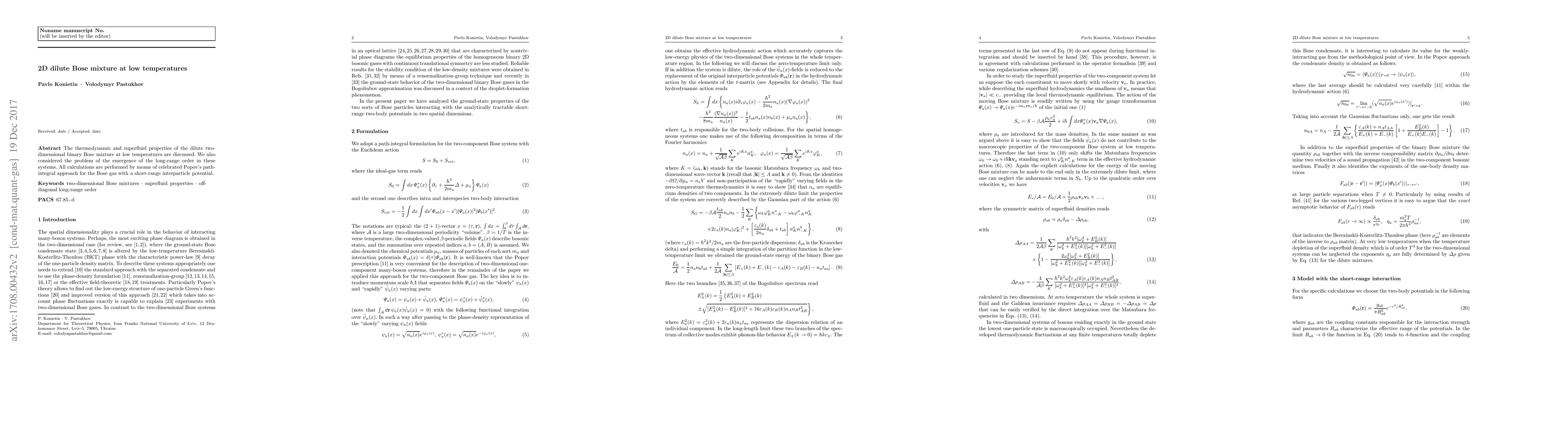 The thermodynamic and superfluid properties of the dilute two-dimensional binary Bose mixture at low temperatures are discussed. We also considered the problem of the emergence of the long-range order in these systems. All calculations are performed by means of celebrated Popov's path-integral approach for the Bose gas with a short-range interparticle potential.