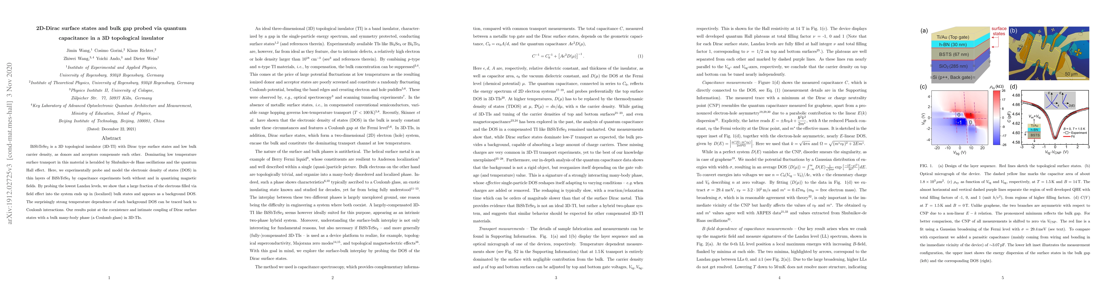 This paper investigates the electronic density of states in BiSbTeSe$_2$, a 3D topological insulator, using quantum capacitance measurements. It reveals that the majority of electrons fill localized bulk states, indicating a strong coupling between Dirac surface states and a bulk many-body phase, likely a Coulomb glass.