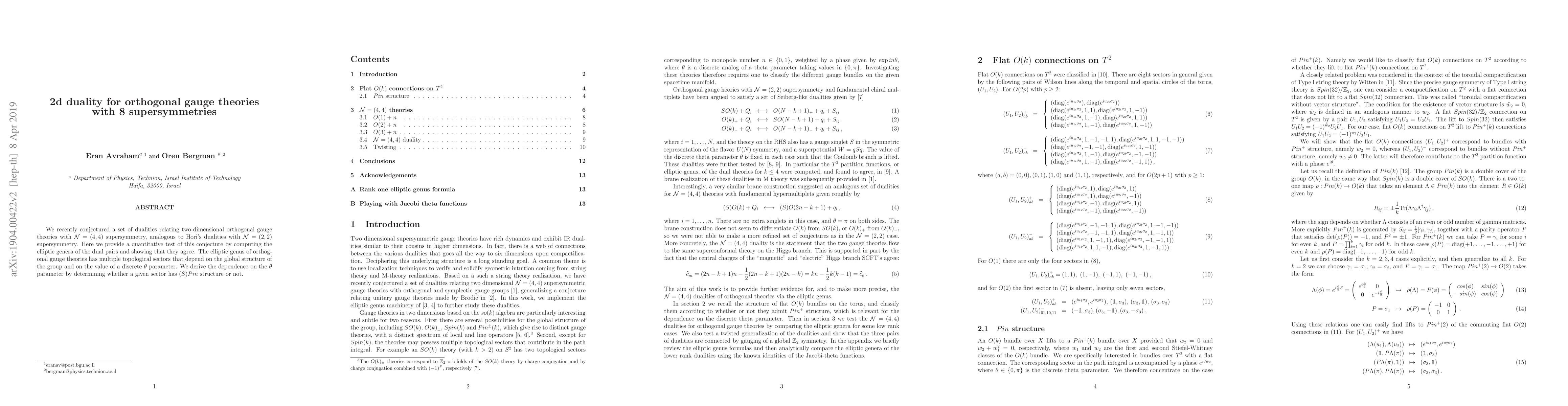 We recently conjectured a set of dualities relating two-dimensional orthogonal gauge theories with $\mathcal{N}=(4,4)$ supersymmetry, analogous to Hori's dualities with $\mathcal{N}=(2,2)$ supersymmetry. Here we provide a quantitative test of this conjecture by computing the elliptic genera of the dual pairs and showing that they agree. The elliptic genus of orthogonal gauge theories has multiple topological sectors that depend on the global structure of the group and on the value of a discrete $\theta$ parameter. We derive the dependence on the $\theta$ parameter by determining whether a given sector has $(S)Pin$ structure or not.